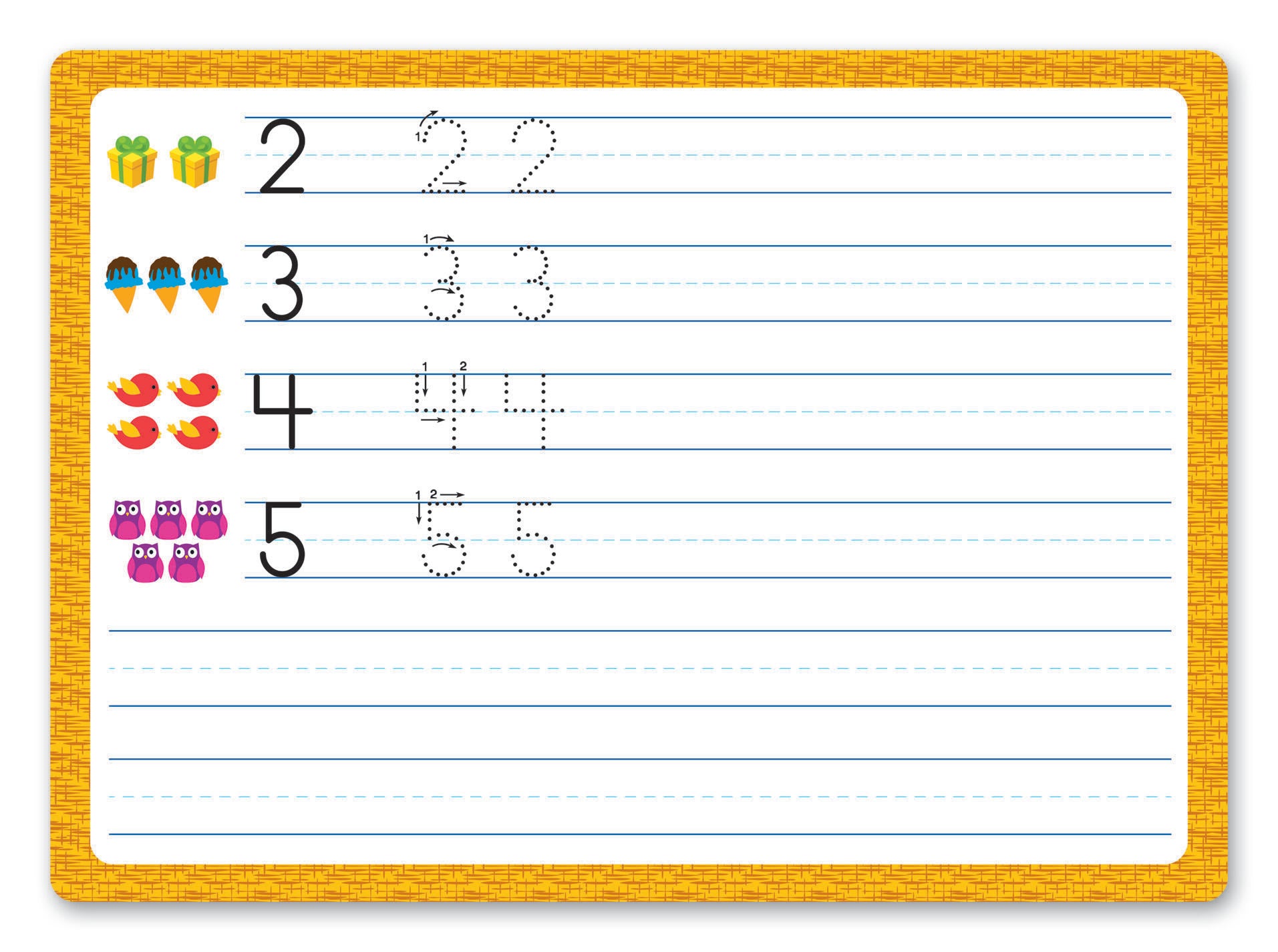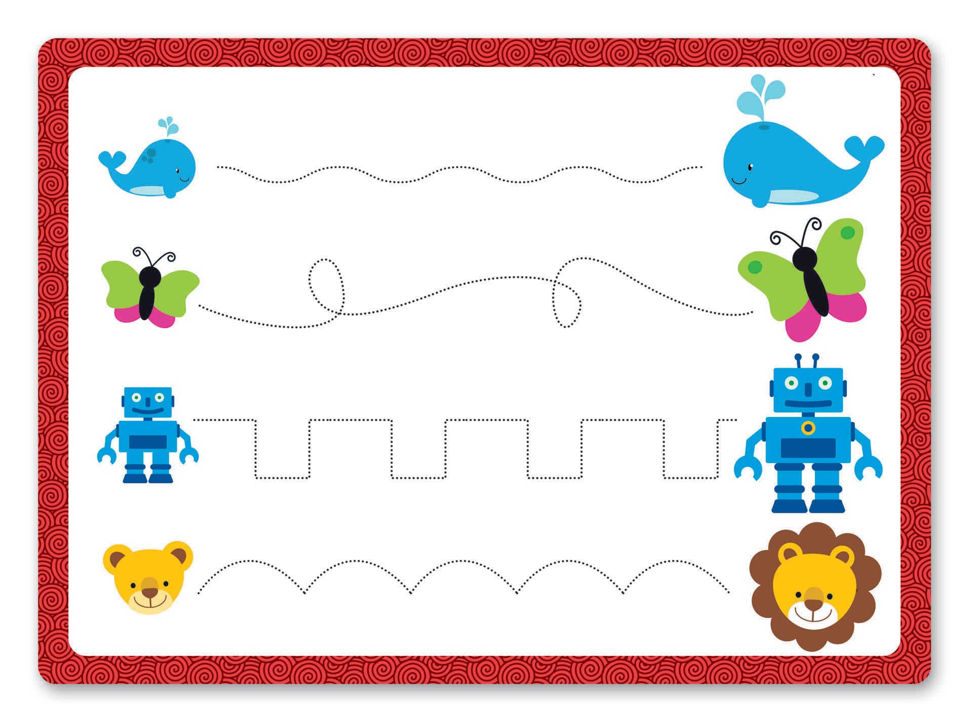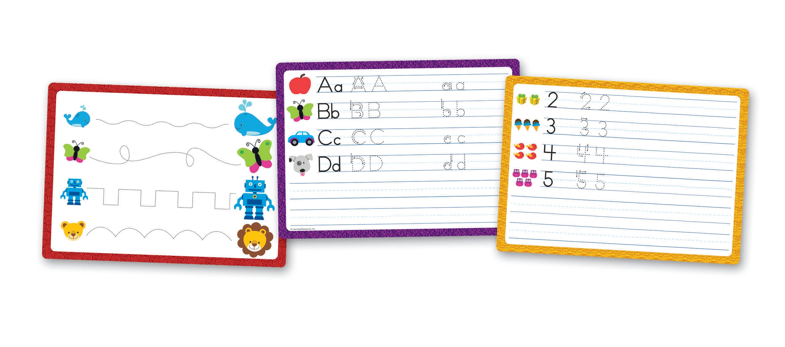 Variety of cards allow children to practice letters, numbers, shapes, patterns, and more