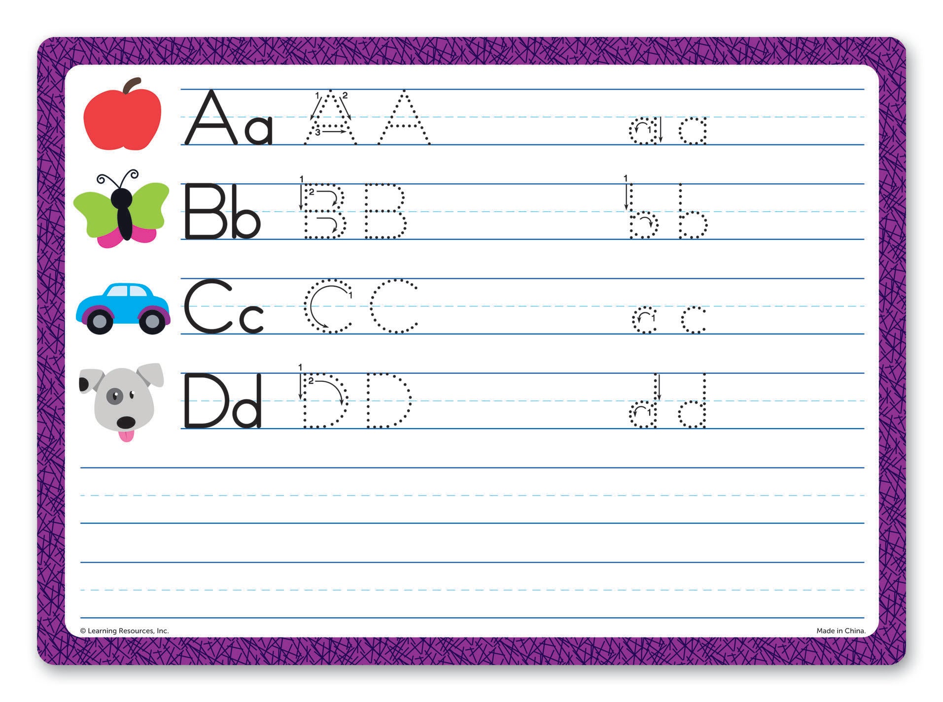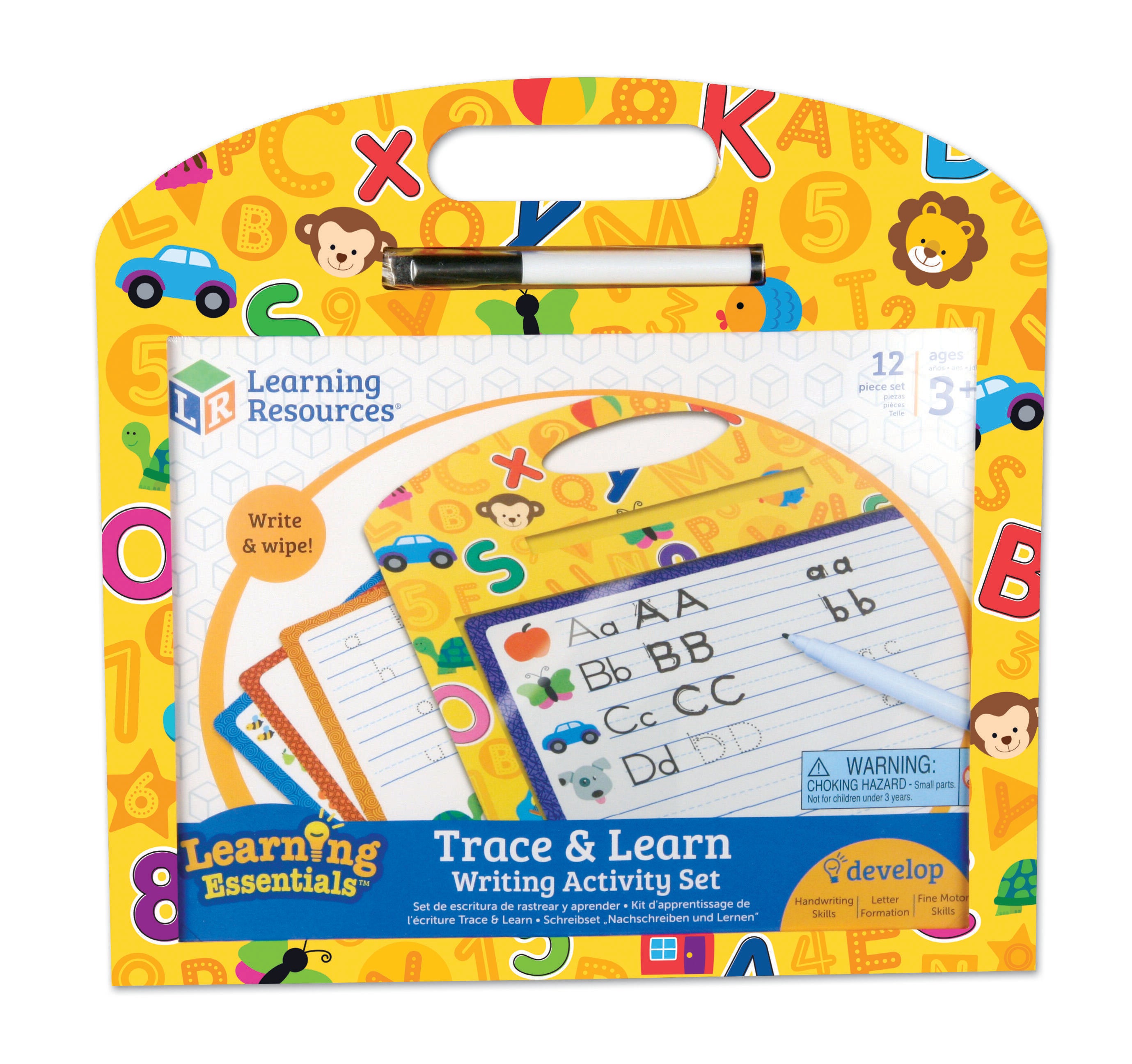 Young students can learn by example with this Trace and Learn Writing Set from Learning Resources! This portable board has a write-and-wipe window that provides an engaging way for children to learn early skills including shapes, letters, and more! Just slide in a card and start practicing then—wipe and repeat. Perfect for learning on the go! This set includes a dry-erase marker so children have everything they need to get started. The board holds a standard 8-1/2 x 11 and A4 paper.