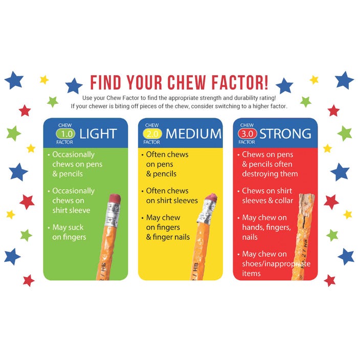 This makes a great purchase if you are unsure which product would be preferred but you know that the color blue is preferred. The springz chewy bracelet by ChuBuddy is a great fidget and chewy and holds its shape and springs back into place. The starfish chewy comes with a breakaway clasp necklace. The ChuBuddy robotz chewy pendant is a fun shape that is ideal for light to medium chewers and also has a breakaway clasp necklace. The B-Buddy chew features a unique, super functional, B-shaped design, making it one of the most versatile handheld chews available. Chewers can use one or two hands to hold onto the loops while they chew on the stem for oral sensory stimulation, hold the stem and chew on the loops or hold one loop while an adult holds the other to help guide and encourage motor control and endurance. It features a breakaway clasp for safety and is always there when needed, but can be easily tucked into the shirt to keep it hidden from view.Features