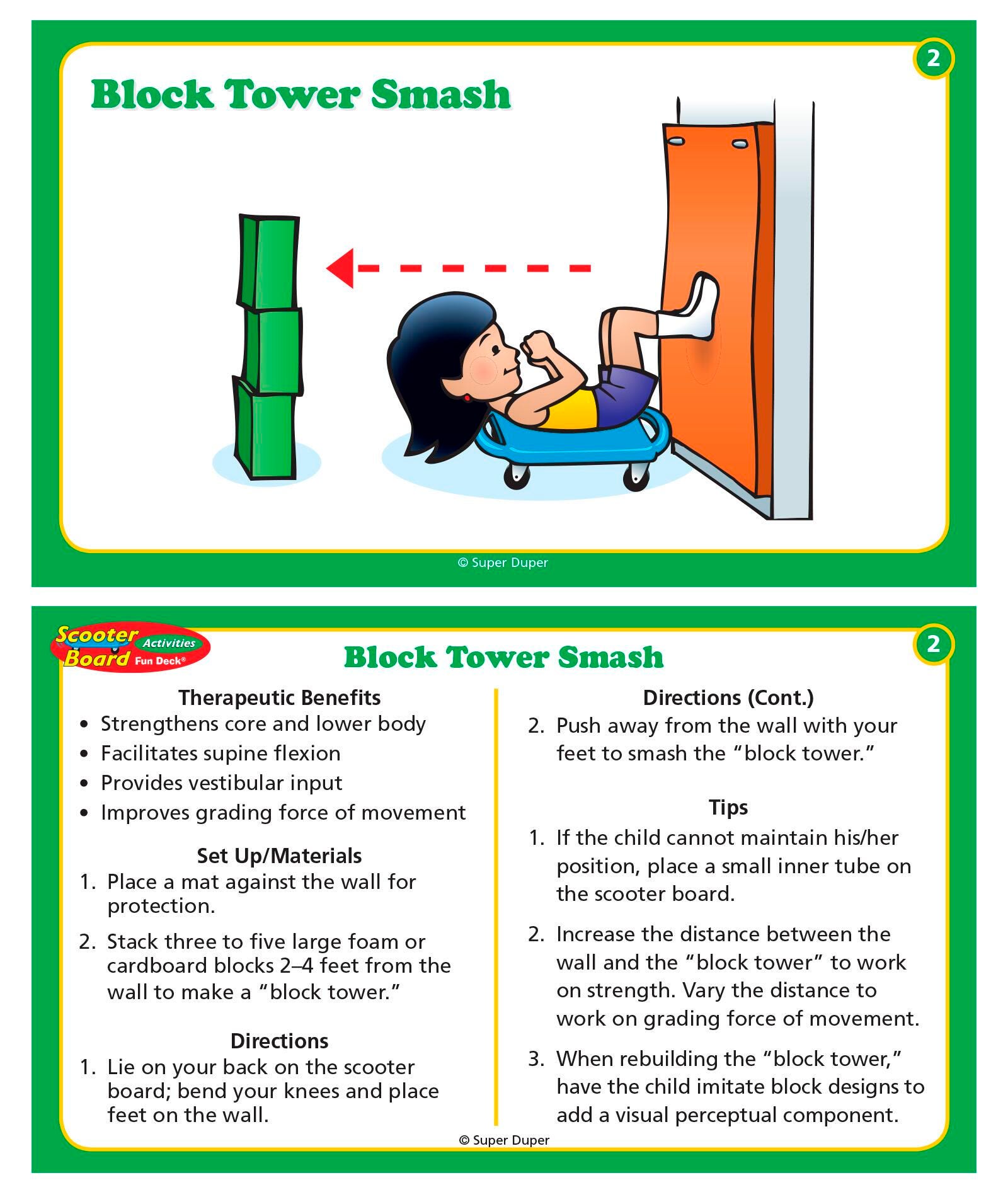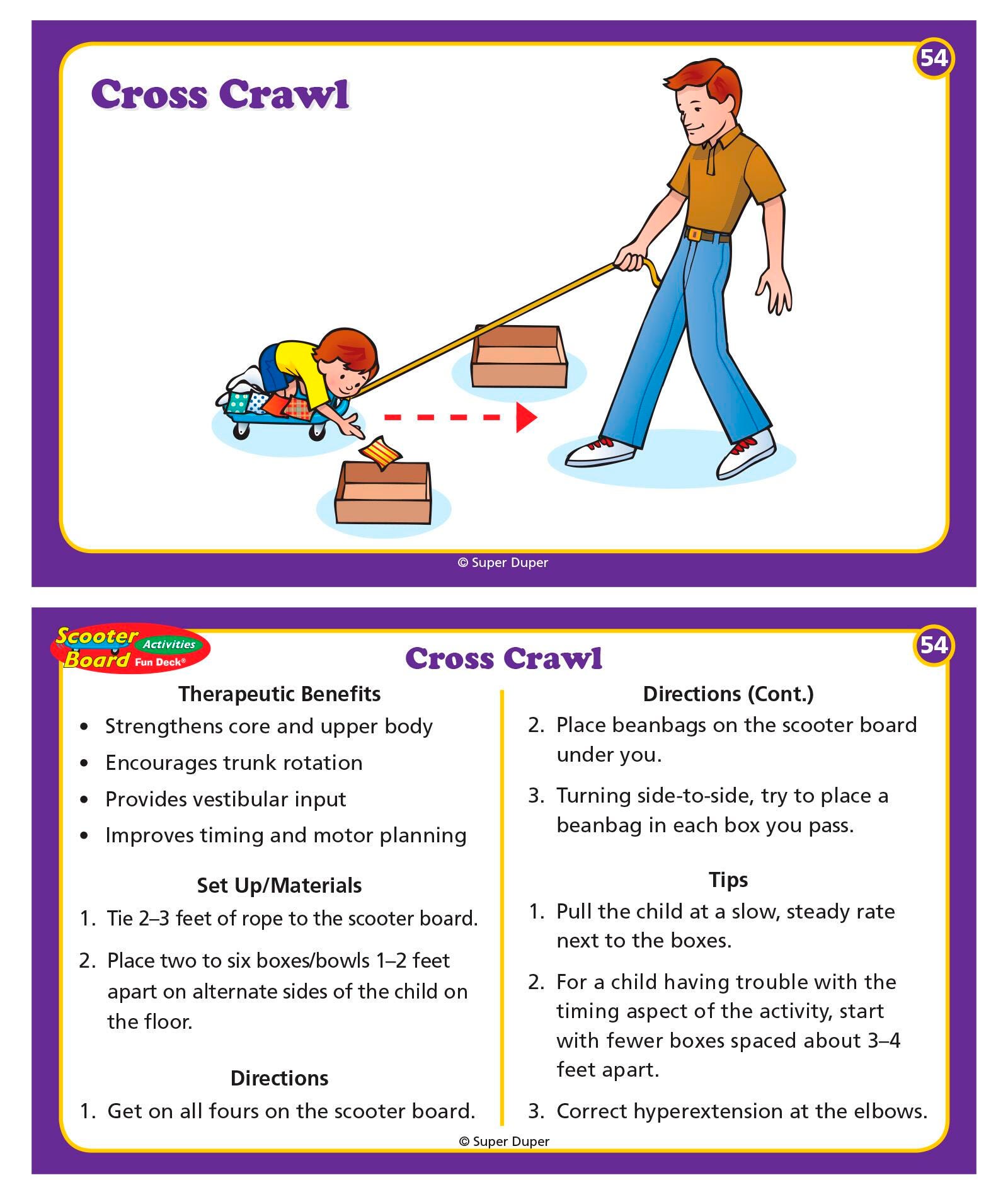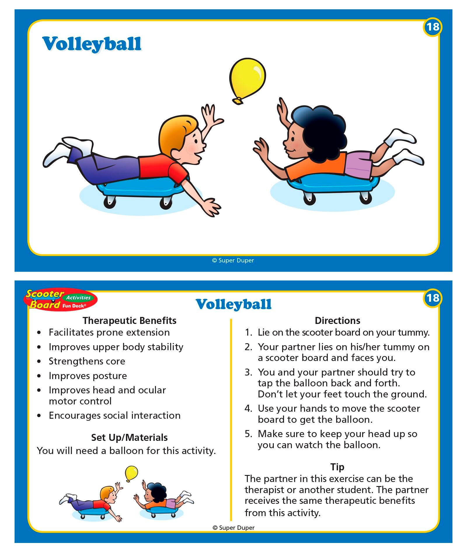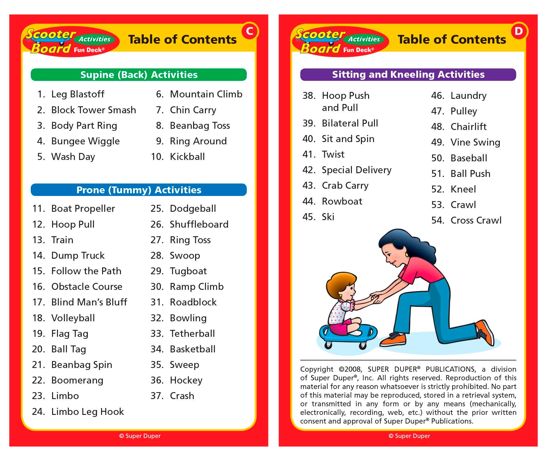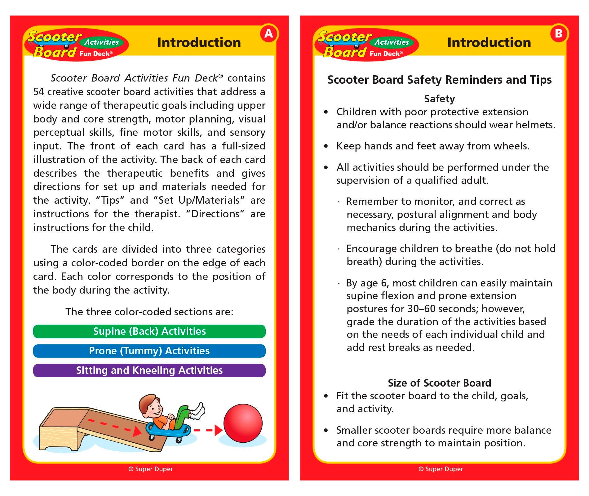 This new Scooter Board Activities Fun Deck contains 54 fun and creative scooter board activities which address a wide range of therapy goals. Activities include upper body and core strength, motor planning, visual perceptual skills, fine motor skills, and sensory input. The deck contains 54 fully illustrated activity cards divided into three color-coded categories: Supine (Back) Activities, Prone (Tummy) Activities, and Sitting and Kneeling Activities. Each card front presents an illustration of the scooter board activity. The card back gives the therapeutic benefits, set up materials, directions, and other tips for using the scooter board. All in a sturdy storage tin. Cards are 5 in x 3 in.