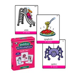 Why do kids love Webber Articulation Cards? Because they have the happiest, most colorful pictures of all artic sets; they come in pairs for playing LOTS of games; and they are easy to hold! Use Webber Articulation Cards with a variety of activities to reinforce articulation, language development, listening, and memory skills. 7 illustrated card decks for the following sounds: S, R, L, Z, and S, R, and L Blends.Includes: