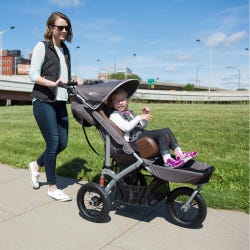 Weighing only 27 pounds, this push chair is easy to fold and can fit into almost any trunk or SUV. It can be used for casual strolling or light jogging through the city or on rough trails. The padded seat can be reclined from 10 degrees to 50 degrees. The many features of this Jogger include a height-adjustable push handle, canopy with window, foot well with side guard, functional rear suspension, rear parking brake, latex-free padded seat and back surface, reclining seat back, 5-point harness, and Fleece/Canvas reversible, washable upholstery. Weight capacity is 110 pounds and dimensions are 26 x 42 x 43 inches.Features