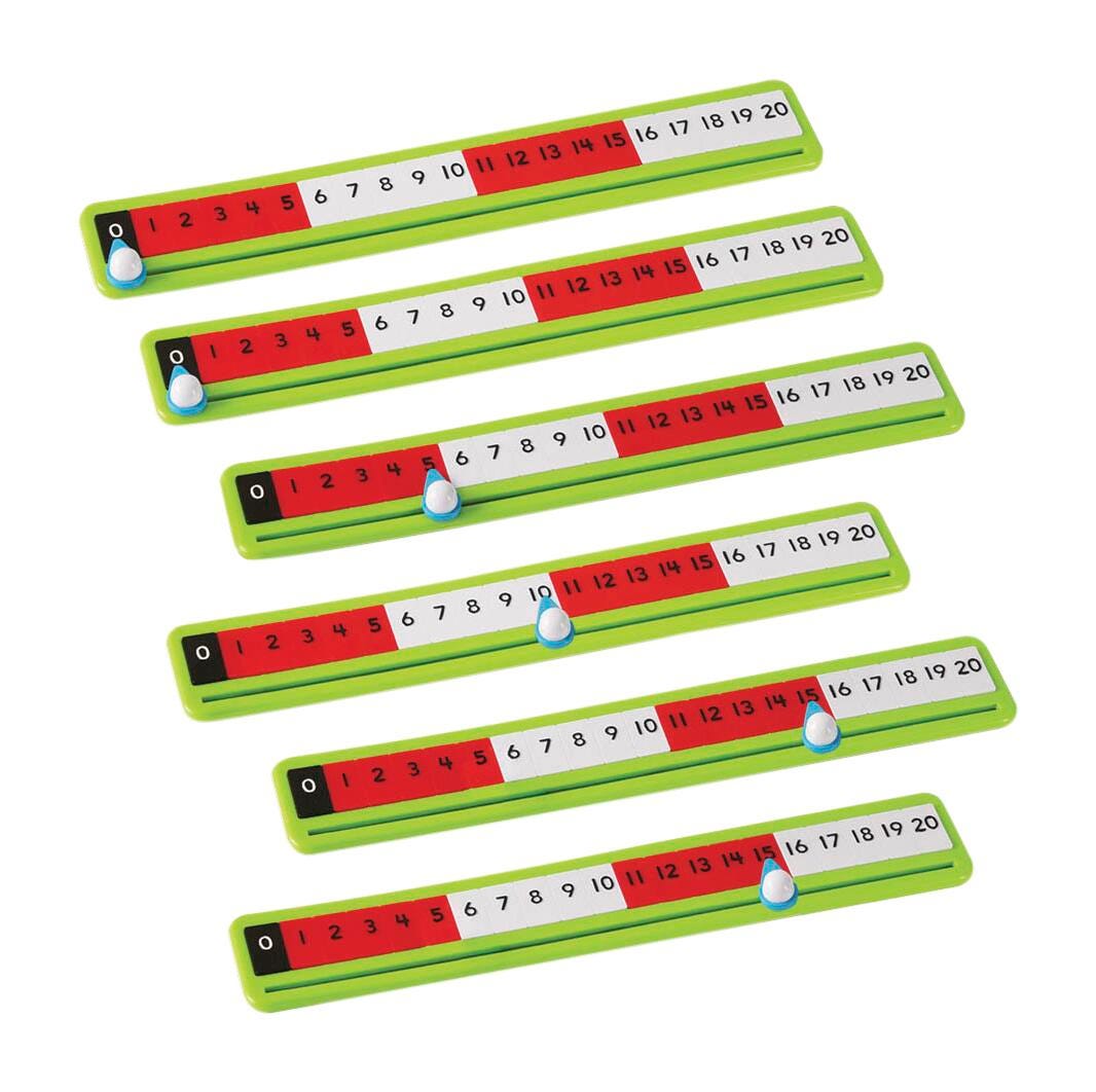 Pointer slides across the bottom and clicks into place below each number. White and red coloring helps students visualize numbers in groups of 5 and aligns with Rekenrek color coding. Ideal for small groups and centers. Each number path measures 12 x 2 inches. Set of 6.Features