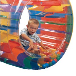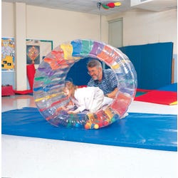 Abilitations SensaTrak helps the slightest movement provide children with a variety of motor and sensory input while challenging their balance. Rhythmic rocking helps calming, while bouncing can provide sensory feedback to help with vestibular orientation. Placement on its side turns the tube into a cozy space for calming or rest. SensaTrak is made of high-quality vinyl for strength and durability with PVC balls inside. It is approximately 50 inches outer diameter and 32 inches inside diameter. Weight limit is 65 pounds. Requires a power inflator (sold separately).Features