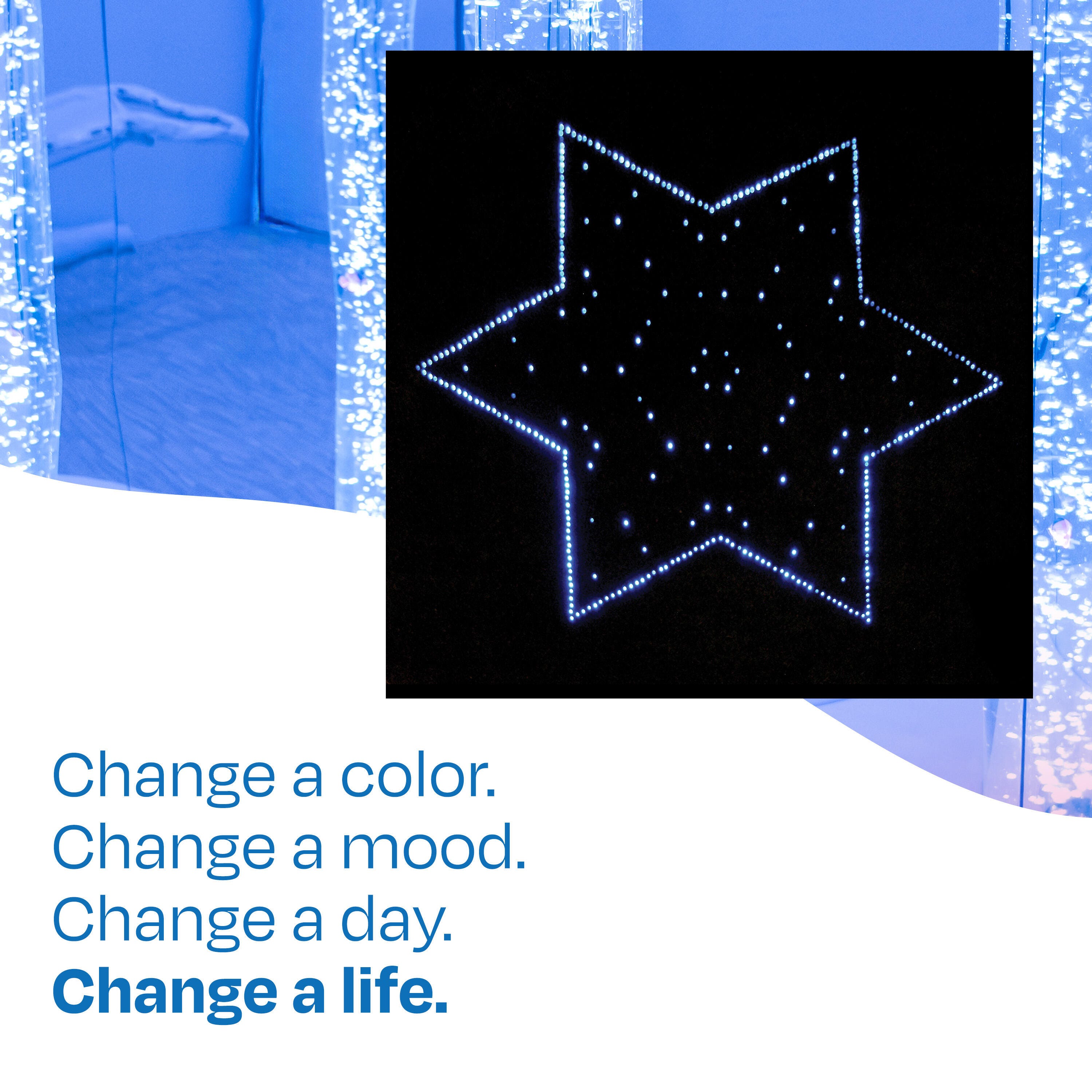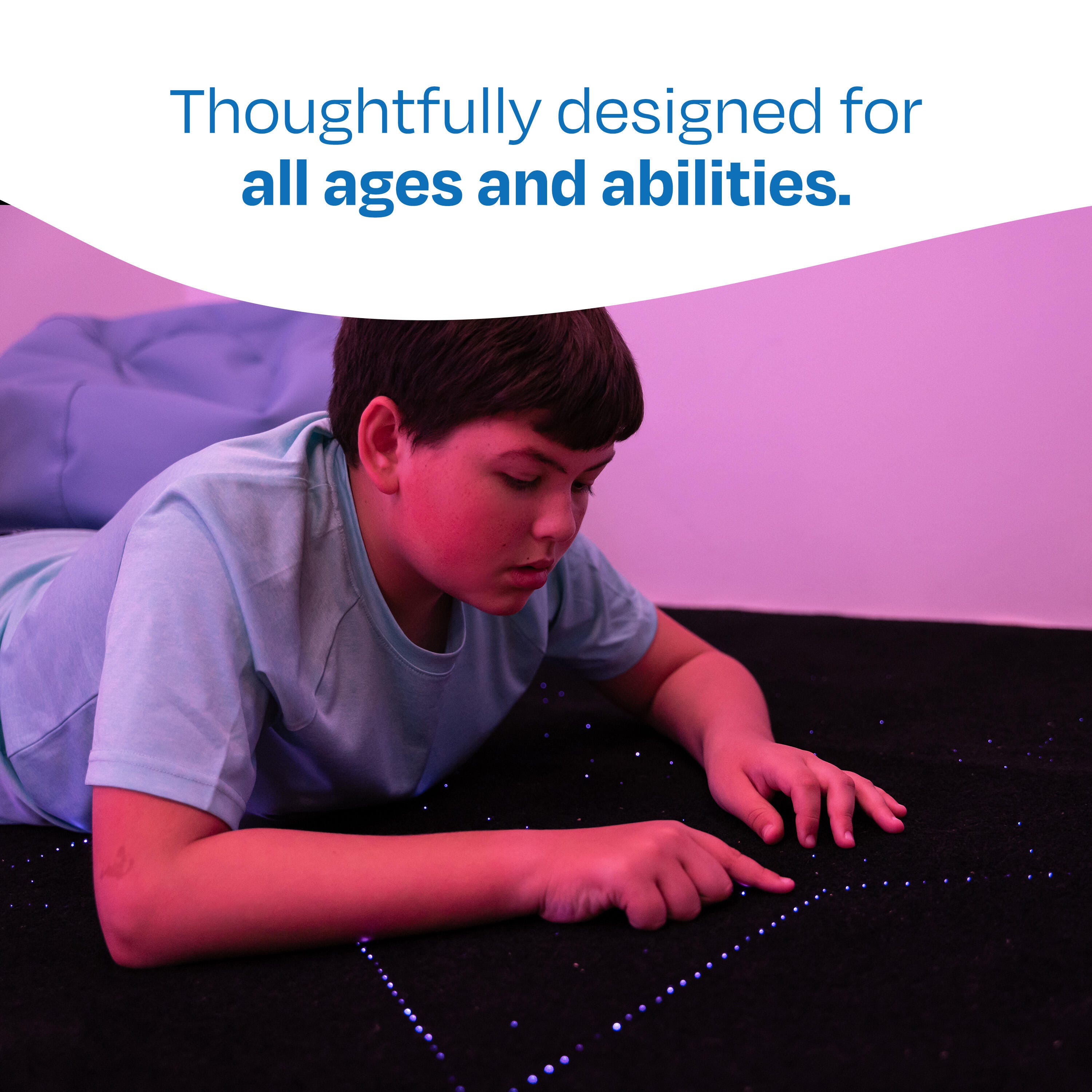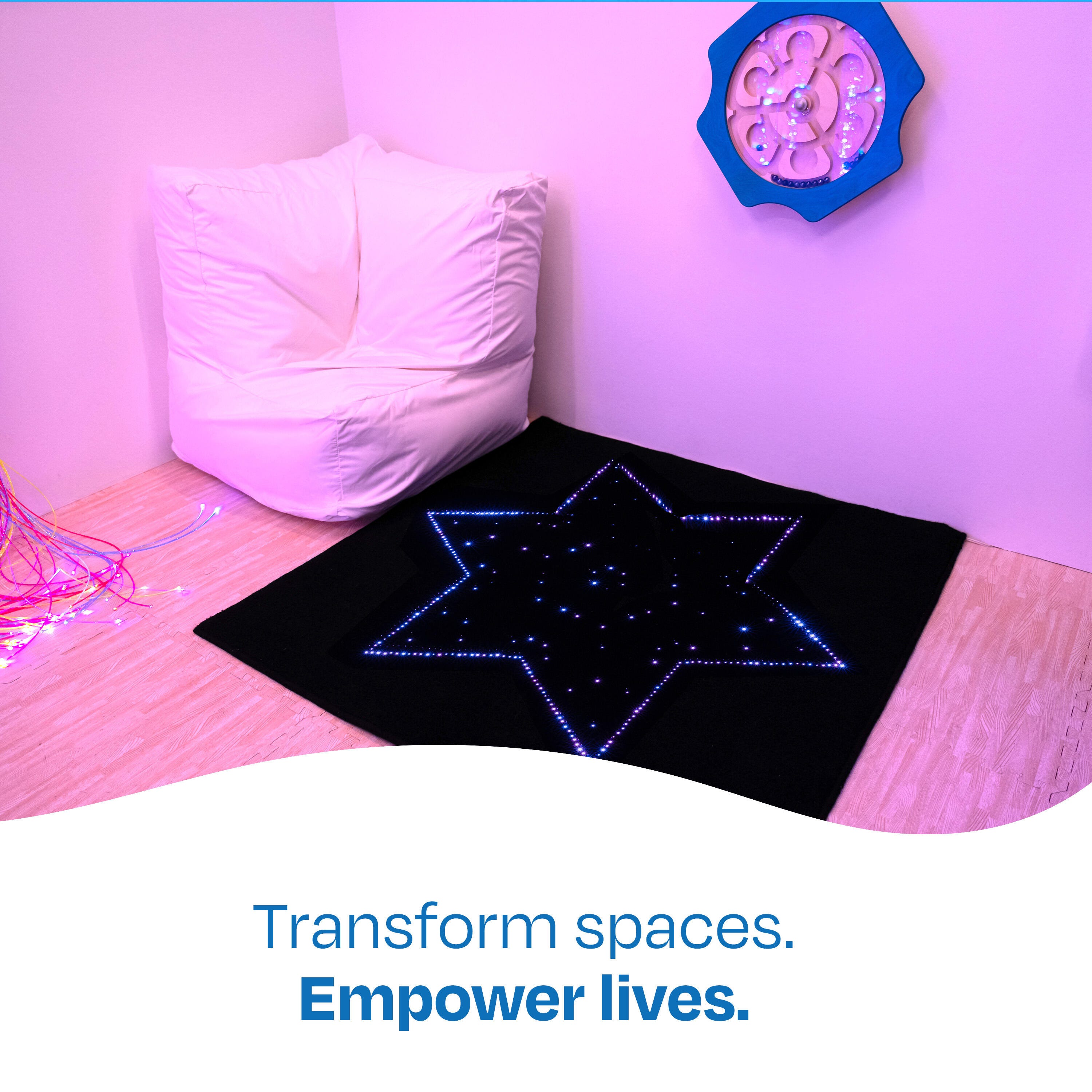 Snoezelen® Star Pattern Interactive Carpet brings cause-and-effect learning to life through stunning light patterns. Whether walking, crawling, or pressing on the sensory carpet, users trigger slow-changing colors that illuminate in a captivating star shape. The fiber-optic construction ensures no electricity passes through the carpet, offering a safe and heat-free experience. Ideal for Snoezelen Multi-Sensory Environments (MSEs), relaxation spaces, or as a galactic-themed accent, this fiber optic carpet provides both visual and soft tactile stimulation. To maintain the integrity of the fiber-optic lights, avoid placing in high-traffic areas or under heavy furniture.