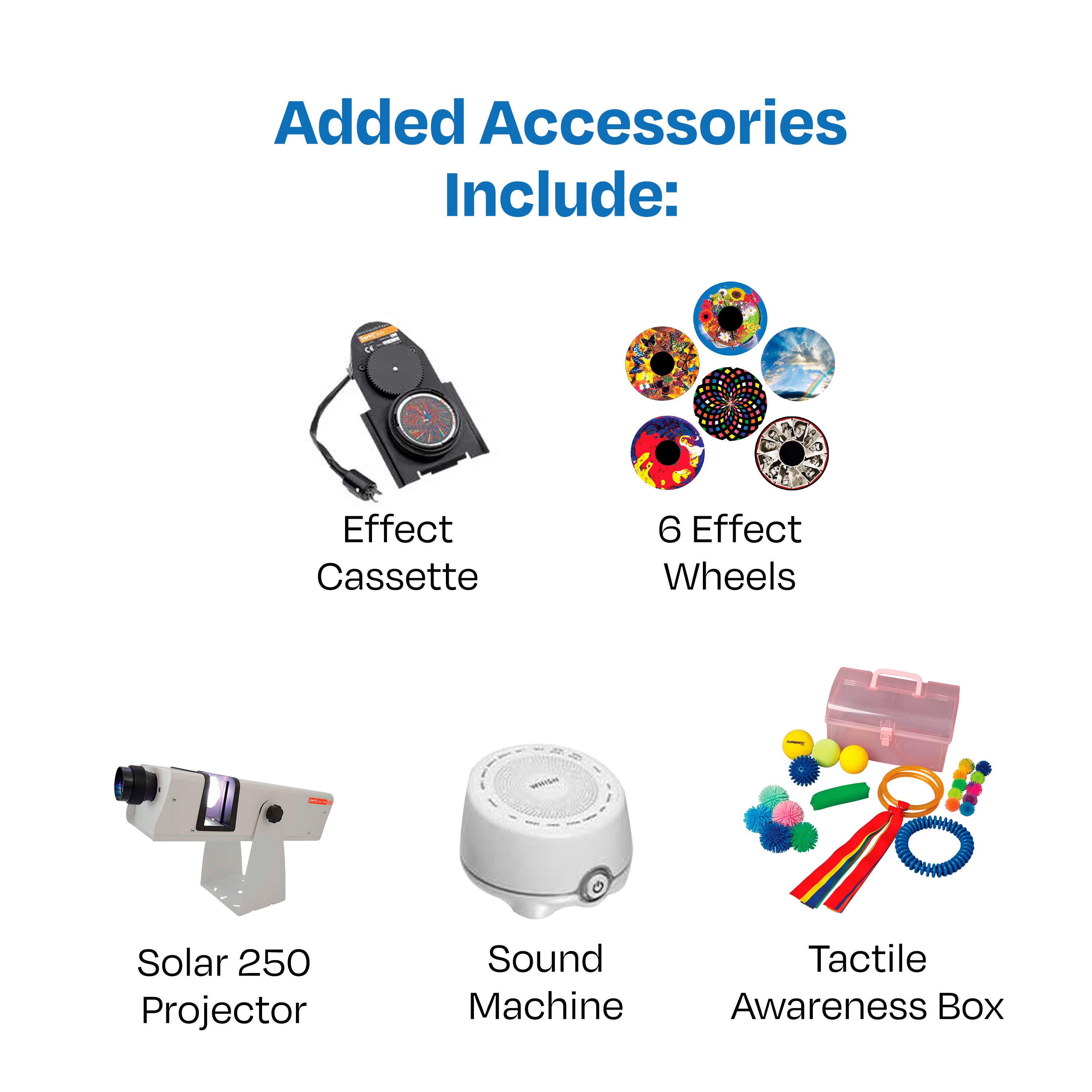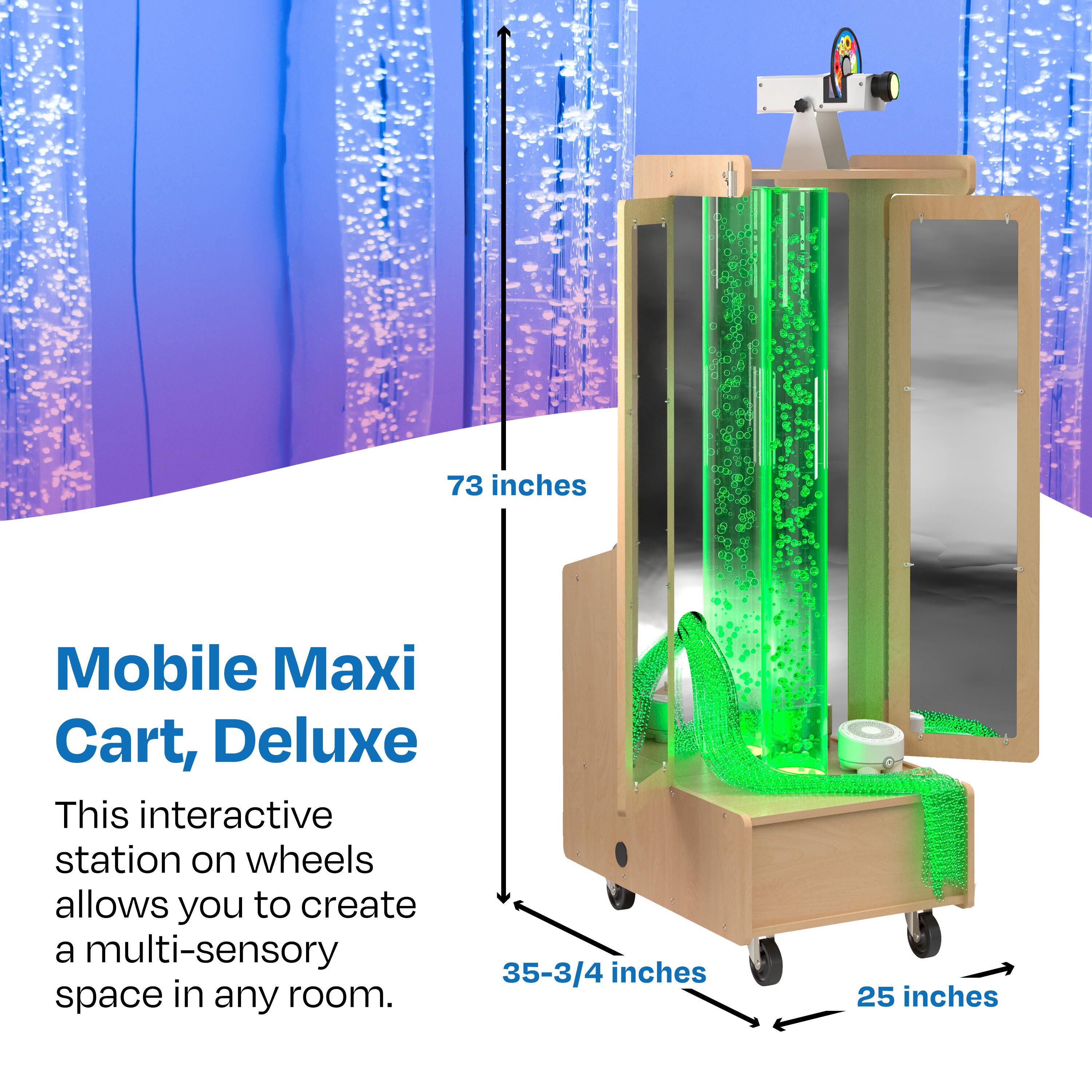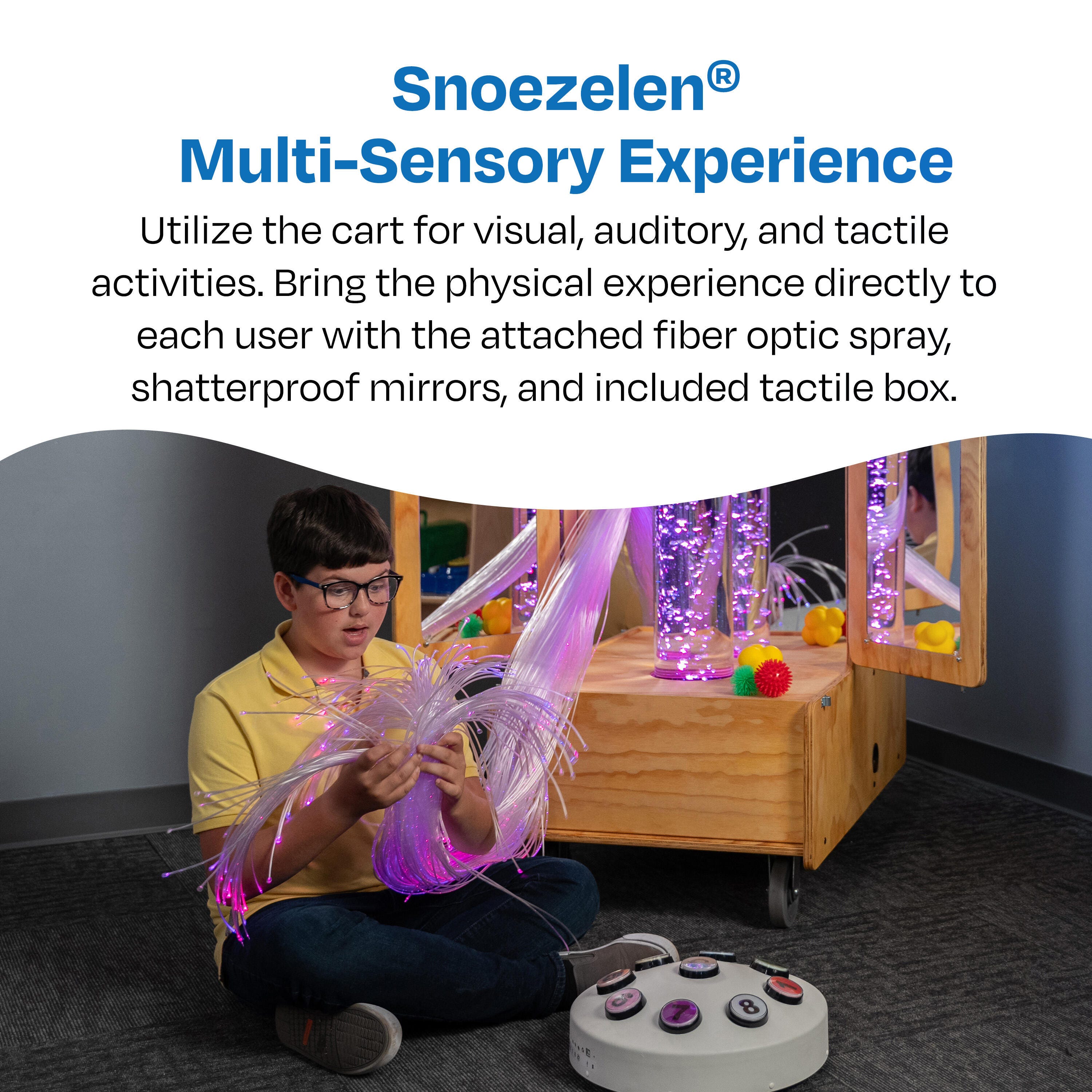 Snoezelen® Mobile Maxi Cart brings a multi-sensory experience wherever you need it, suitable for all ages and abilities. Don’t have space for a permanent sensory room? No problem. This portable sensory cart on wheels features a full sized bubble tube, shatterproof mirrors, an interactive fiber optic light spray, projector, and sound machine. The lockable cabinet in the back provides secure storage for accessories. The mirrors expand and enhance each visual sensory experience without taking up extra room in storage. Large locking caster wheels and a handle allow for easy maneuverability throughout any space; move the cart from one corner to another or from room to room as needed. We offer a full range of Snoezelen Mobile Cart options. View the product brochure.