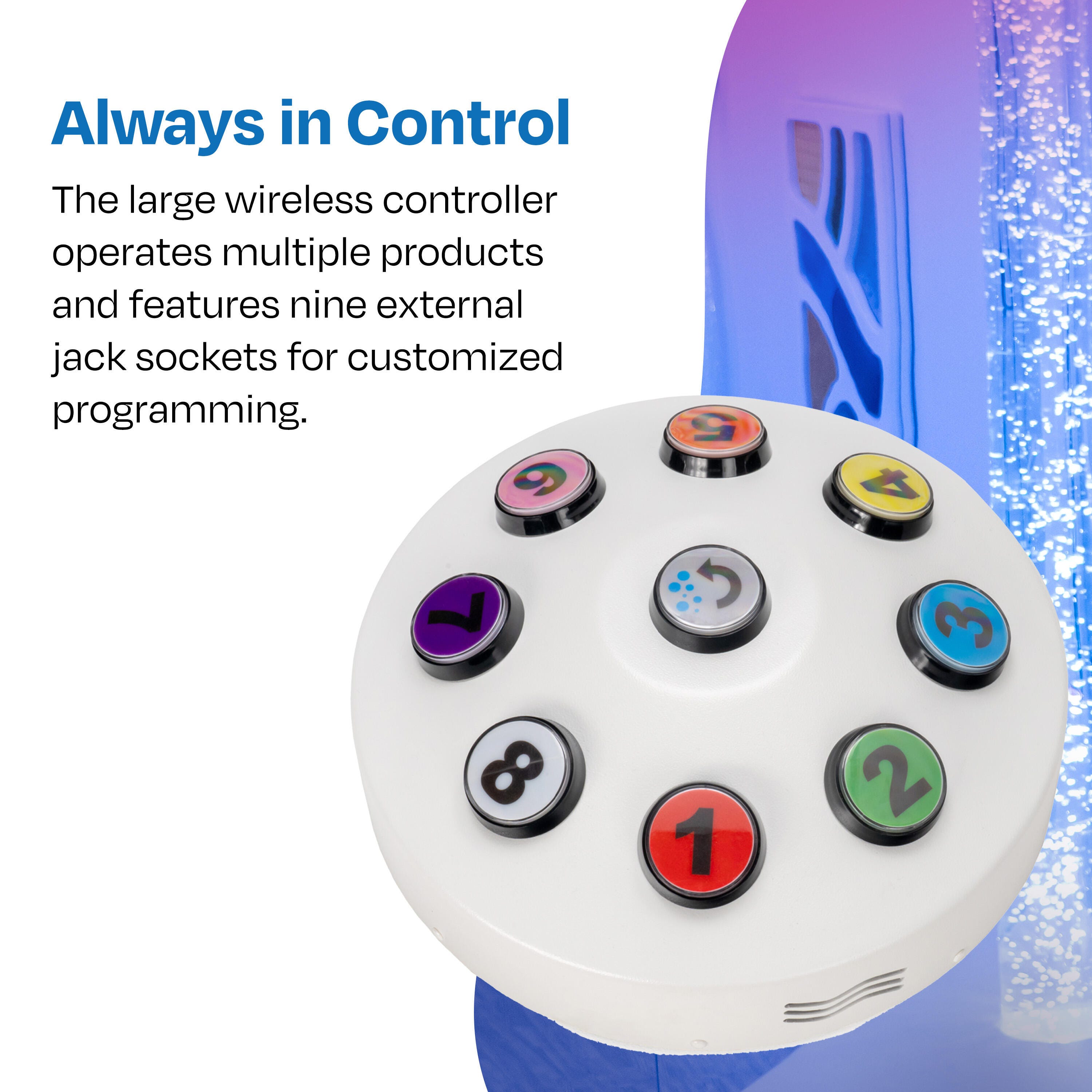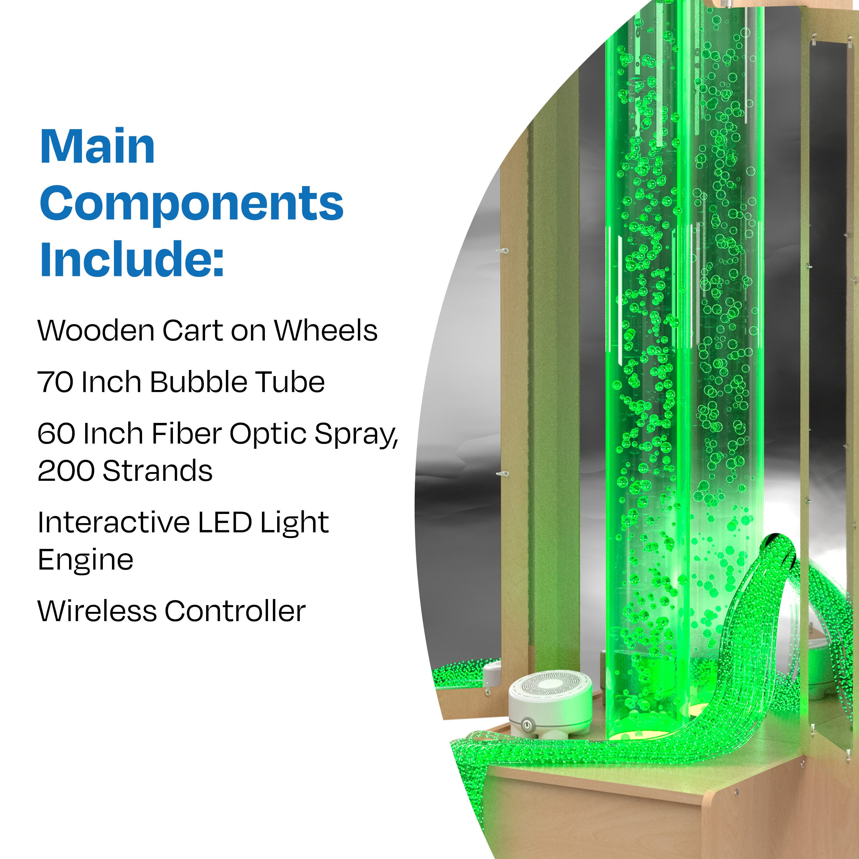 Shatterproof acrylic mirrors surround an illuminated bubble tube and fiber optic spray on the front of the cart