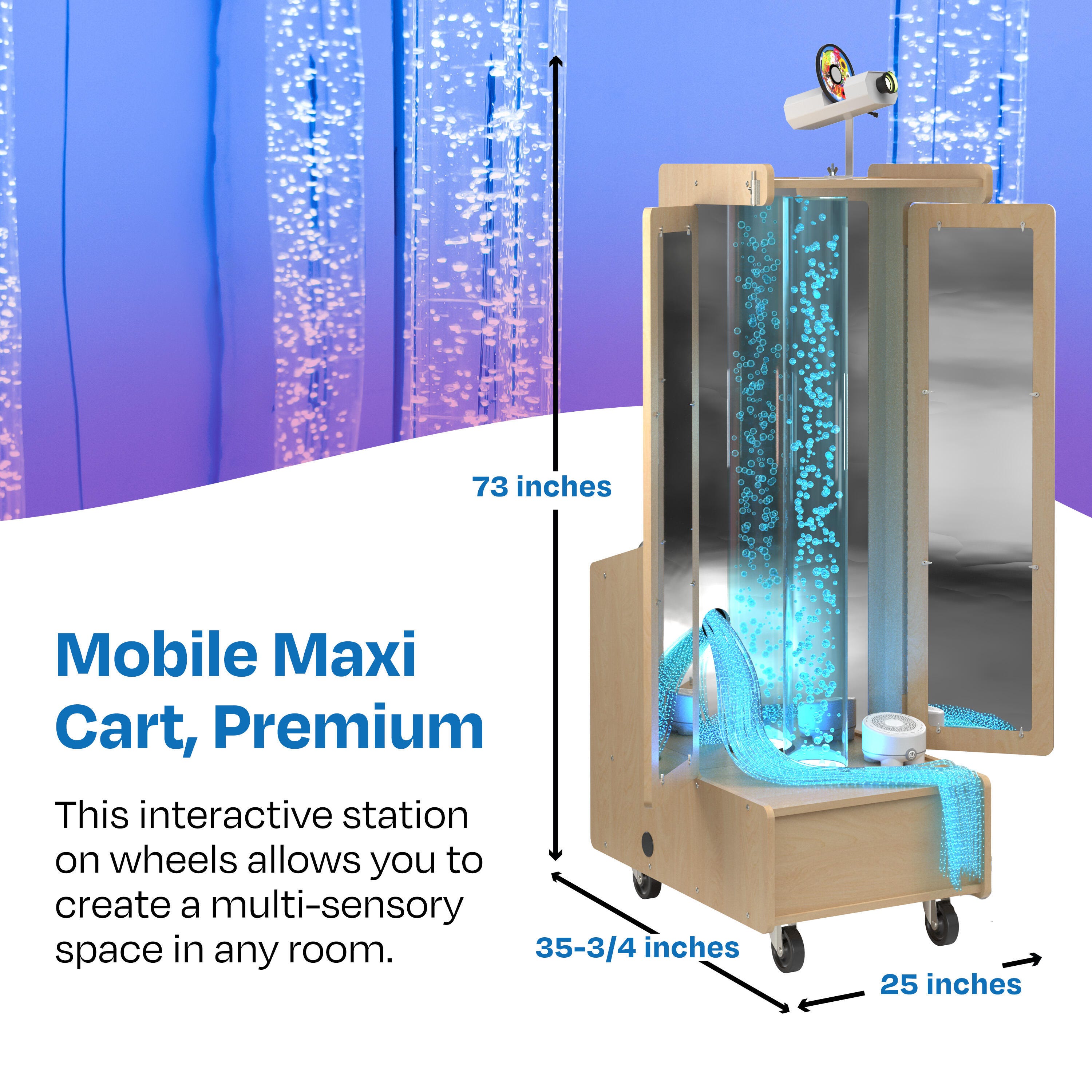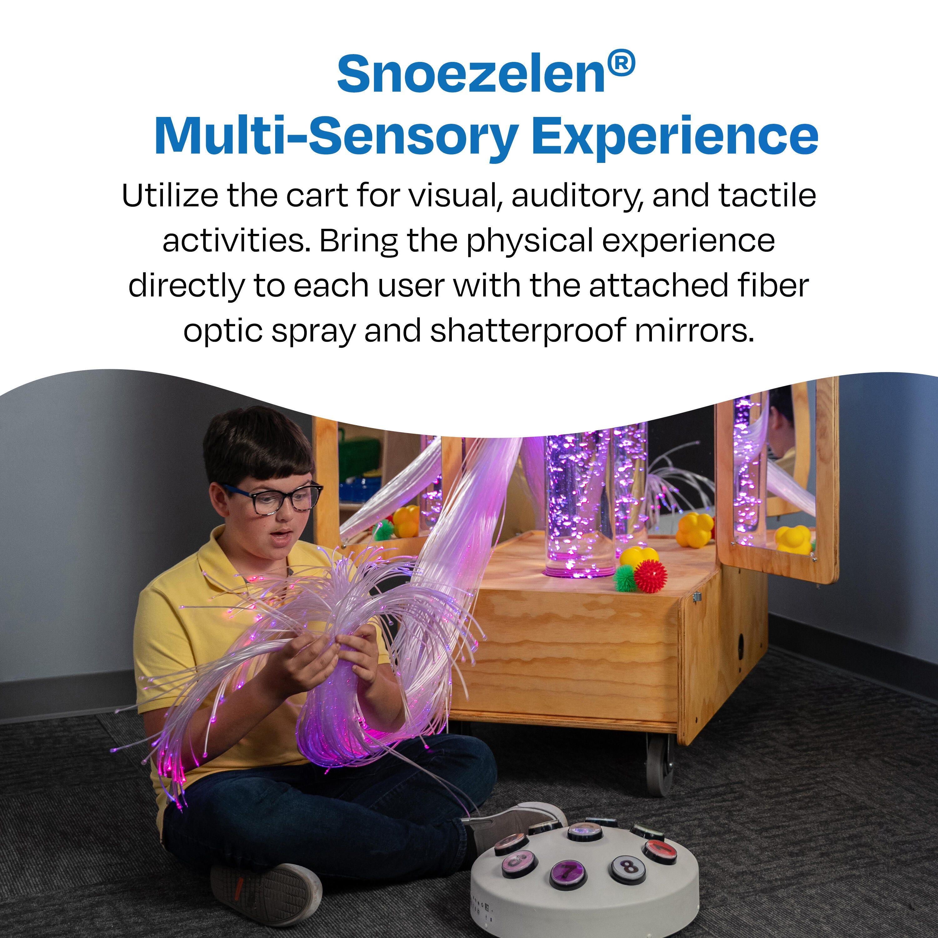 Snoezelen® Mobile Maxi Cart brings a multi-sensory experience wherever you need it, suitable for all ages and abilities. Don’t have space for a permanent sensory room? No problem. This portable sensory cart on wheels features a full sized bubble tube, shatterproof mirrors, an interactive fiber optic light spray, projector, and sound machine. The lockable cabinet in the back provides secure storage for accessories. The mirrors expand and enhance each visual sensory experience without taking up extra room in storage. Large locking caster wheels and a handle allow for easy maneuverability throughout any space; move the cart from one corner to another or from room to room as needed. We offer a full range of Snoezelen Mobile Cart options. View the product brochure.