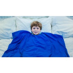 Hospital-grade wipe-clean weighted blanket is 12-pounds and is appropriate for 6 to 10 years olds, or who weight 46 to 70 pounds. Person using blanket must be able to take the blanket off themselves independently.