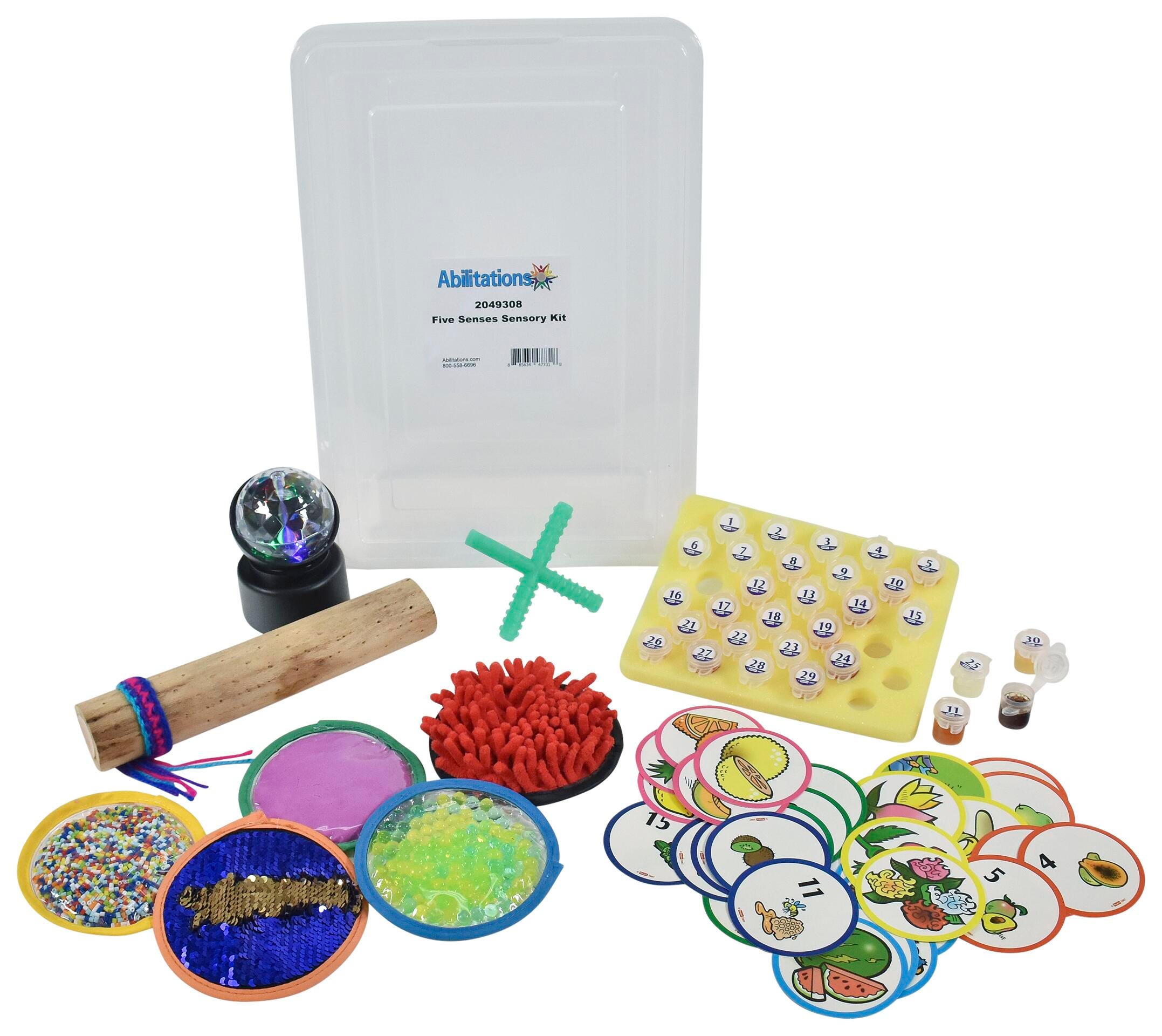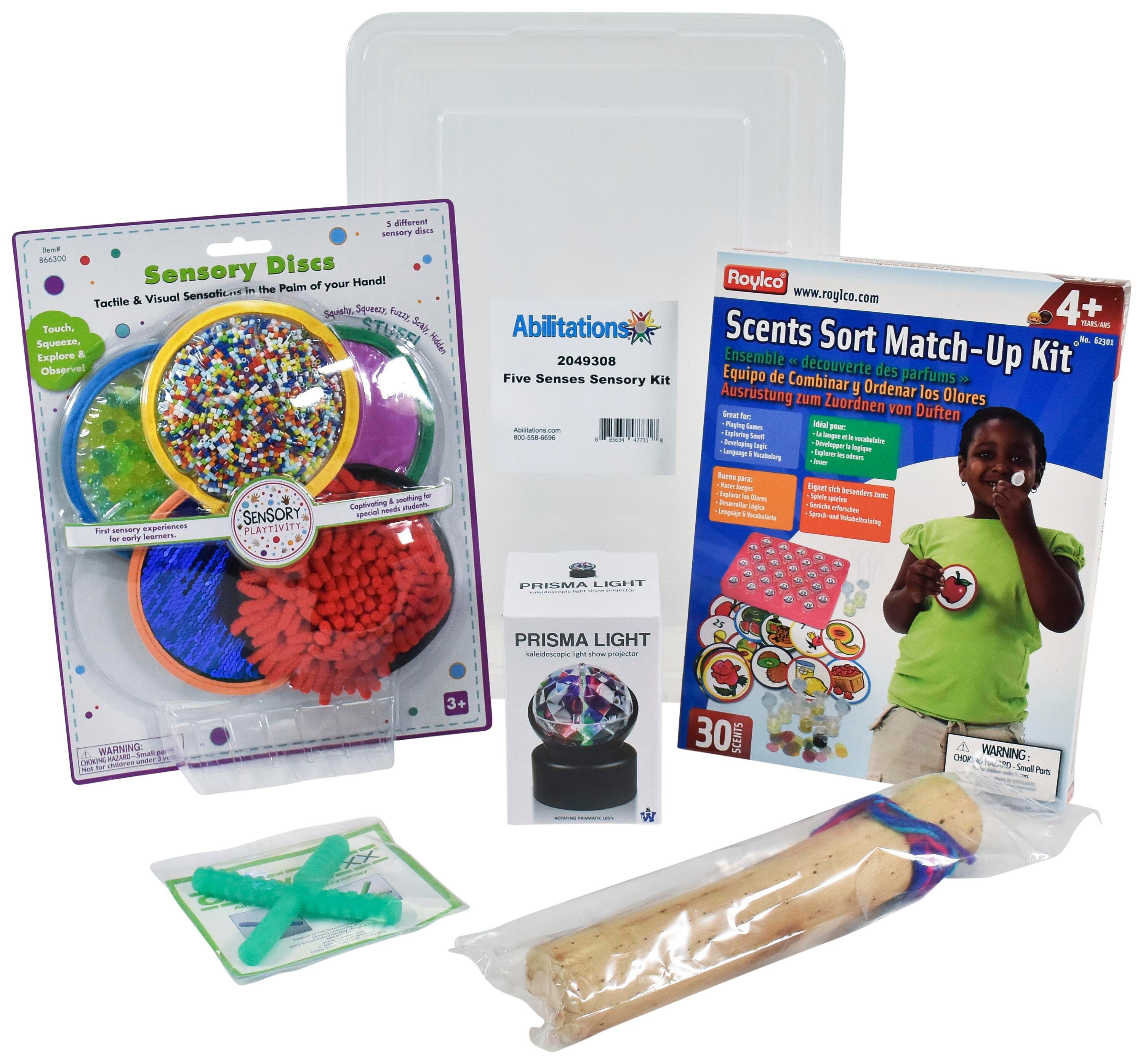 Children learn and grow by using all five senses; sight, taste, touch, hearing and smell. The Abilitations Five Senses Sensory Kit allows kids to explore each sense with a unique sensory item. SIGHT: Prisma Light is a kaleidoscopic light show projector with changing color for visual stimulation. TASTE: The flavor of the Spearmint Chew Stixx combined with the textures were designed by therapists to simulate the ever-changing textures of food, therefore assisting with children who have sensory issues when certain textures are placed in their mouth. TOUCH: 5 Sensory Discs allows kids to feel and touch different textures and fabrics. Discs include fuzzy, squishy, scaly, hidden and squeezy textures. SOUND: Tilting the rain stick back and forth provides a soothing “rain” sound. SMELL: Scents Sort Match-Up Kit contains 30 self-sealing scent cups and 6 different games for kids to sniff out what cup matches each card. Five Senses kit comes in a clear bin for easy storage. Prisma Light requires 3 AA batteries (not included). Kit is appropriate for ages 6 years and up.Features