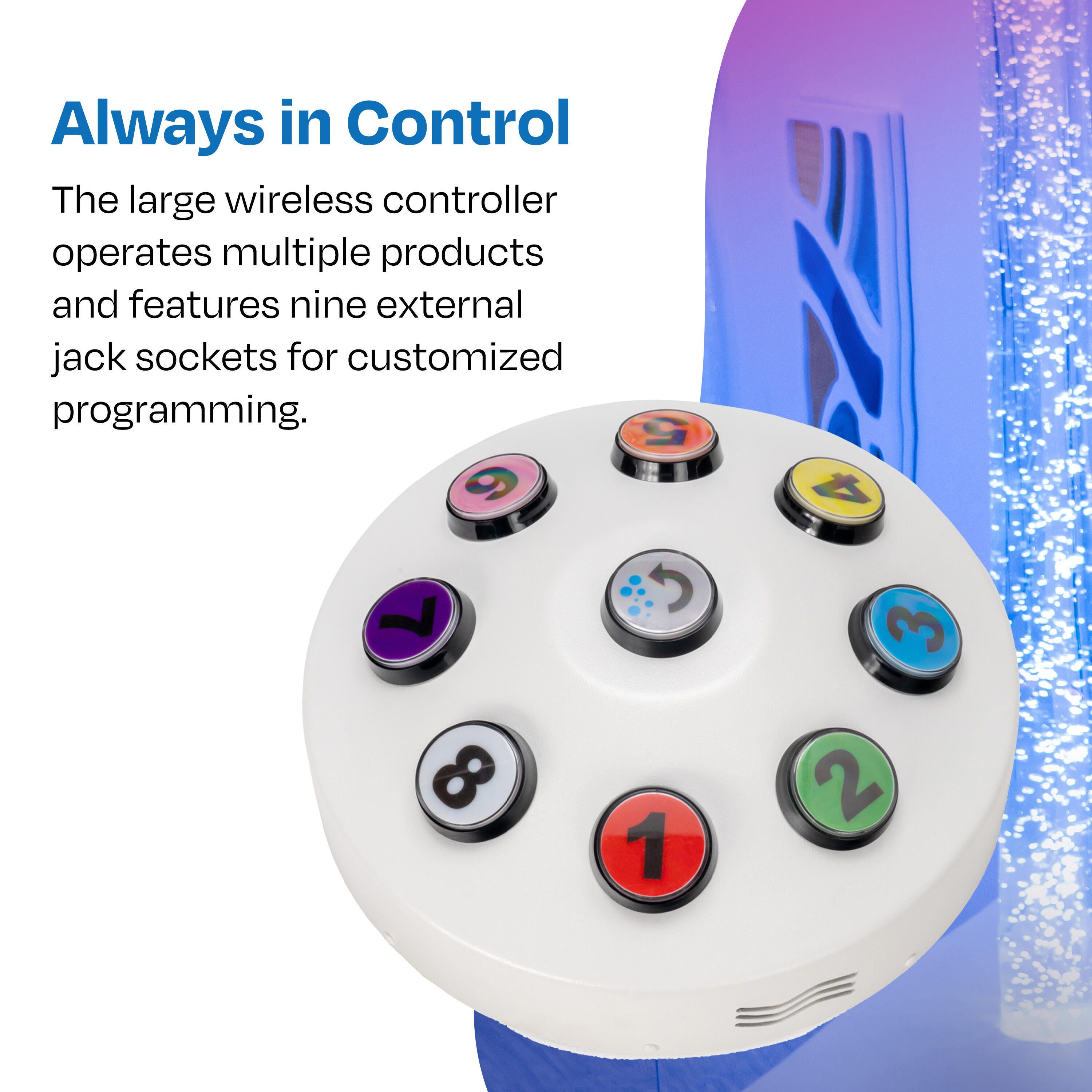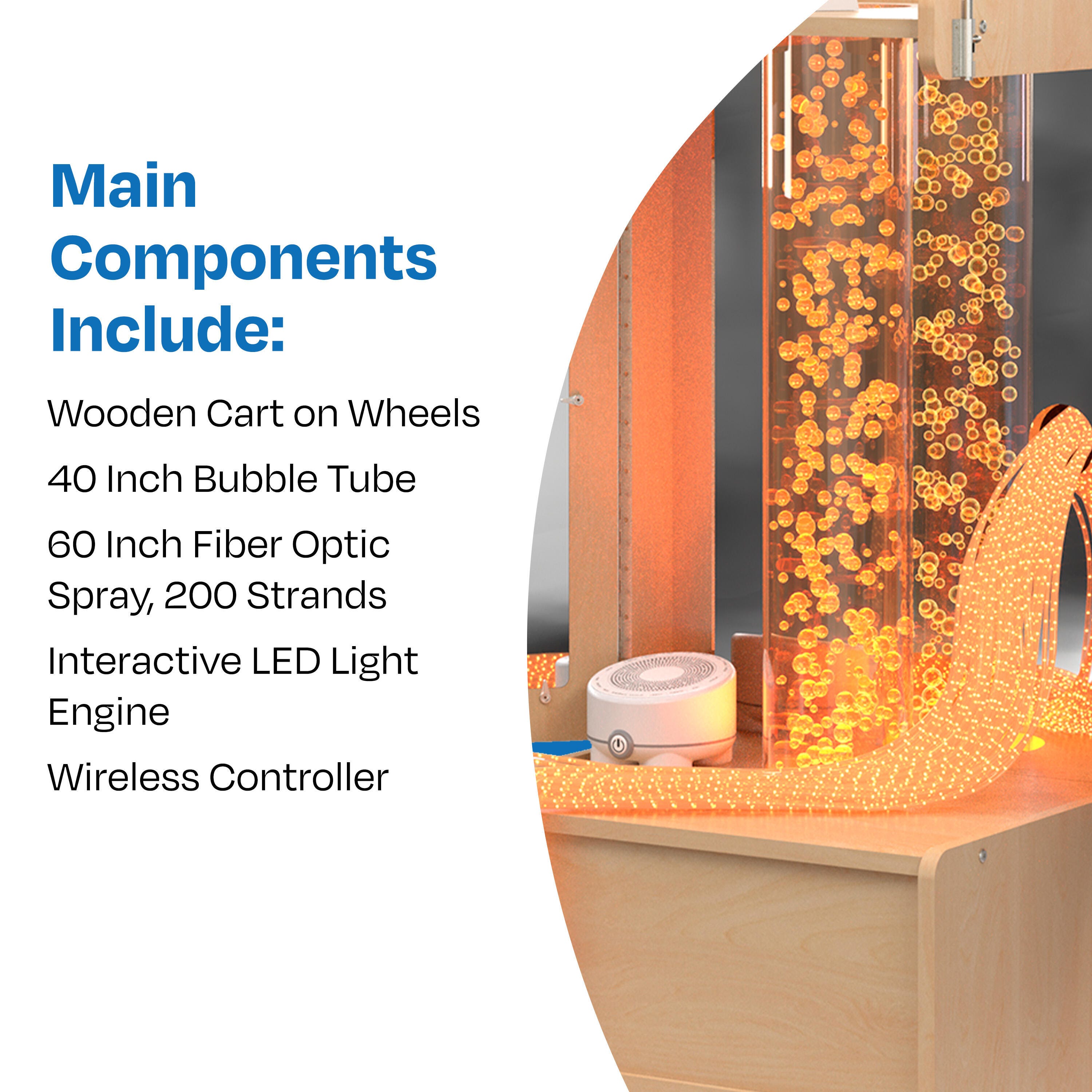 Shatterproof acrylic mirrors surround an illuminated bubble tube and fiber optic spray on the front of the cart