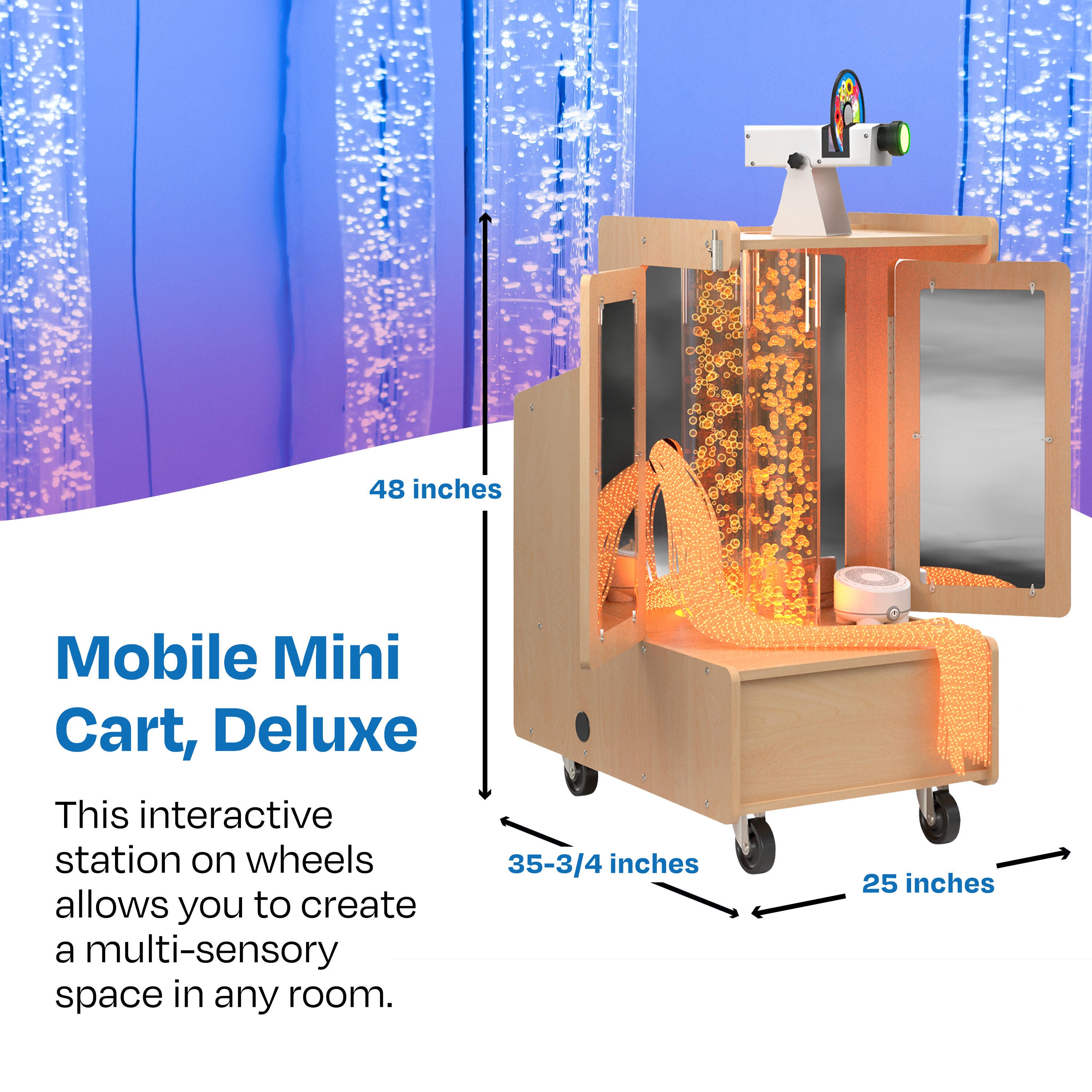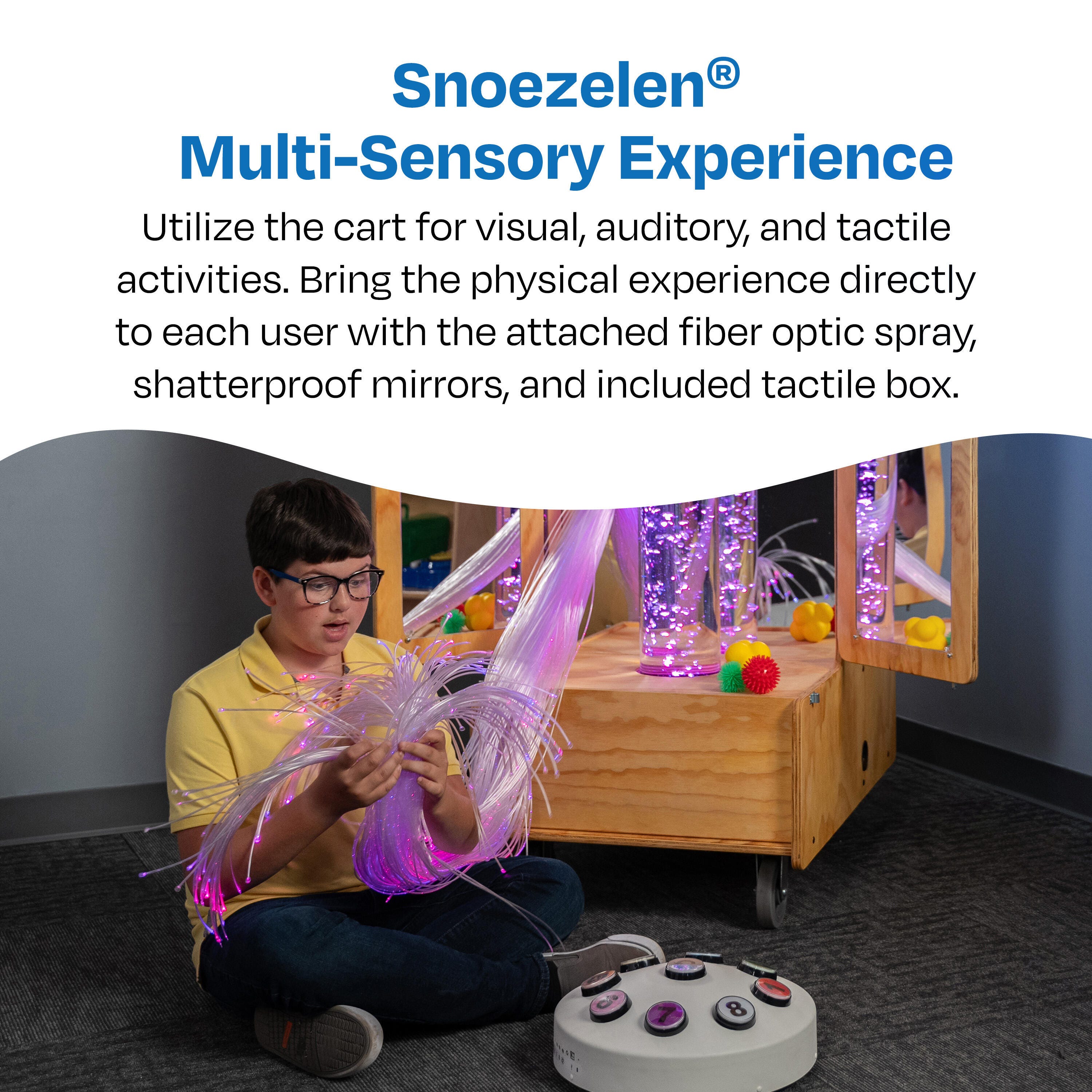 Snoezelen® Mobile Mini Cart brings a multi-sensory experience wherever you need it, suitable for all ages and abilities. Don’t have space for a permanent sensory room? No problem. This portable sensory cart on wheels features a bubble tube, shatterproof mirrors, an interactive fiber optic light spray, projector, and sound machine. The lockable cabinet in the back provides secure storage for accessories. The mirrors expand and enhance each visual sensory experience without taking up extra room in storage. Large locking caster wheels and a handle allow for easy maneuverability throughout any space; move the cart from one corner to another or from room to room as needed. We offer a full range of Snoezelen Mobile Cart options. View the product brochure.