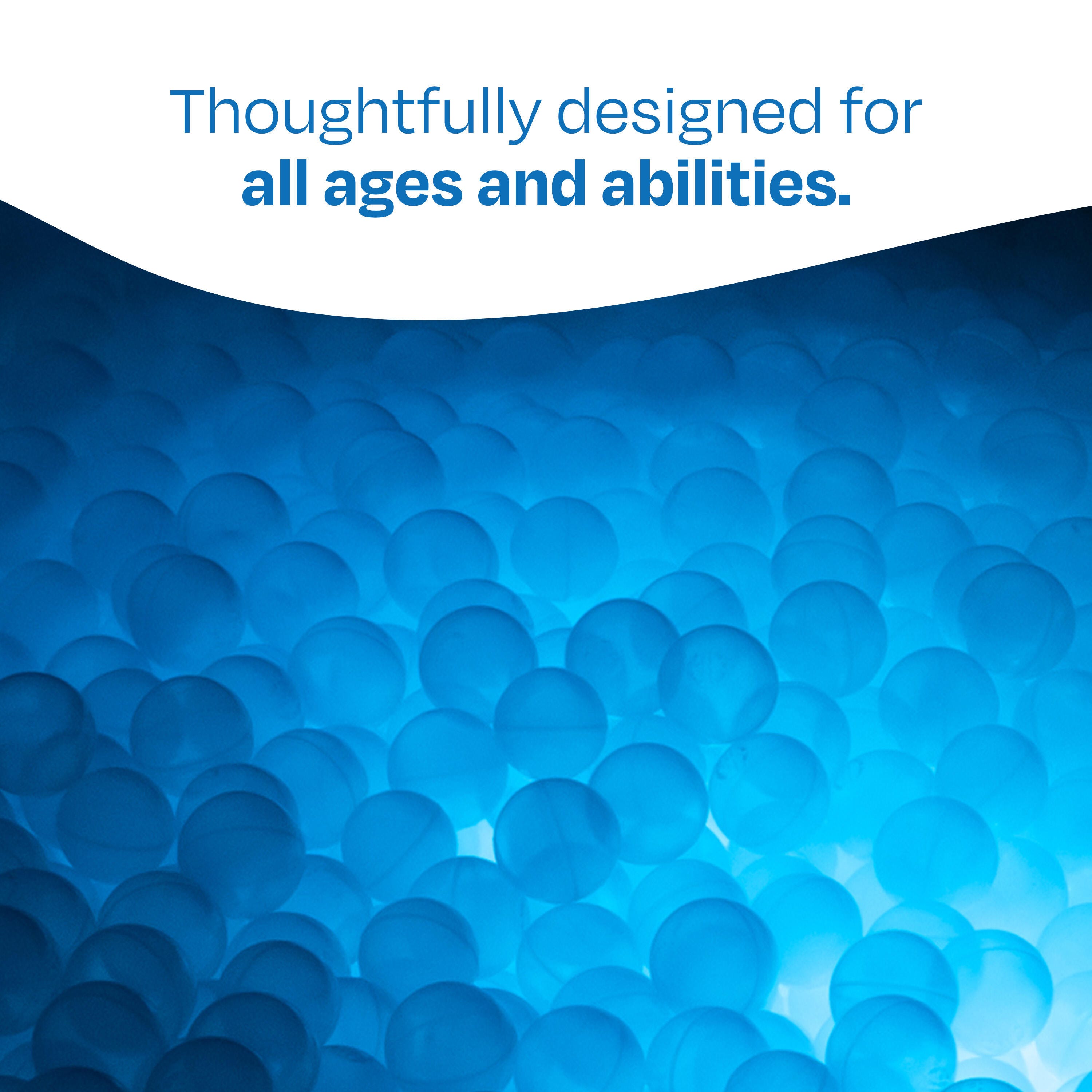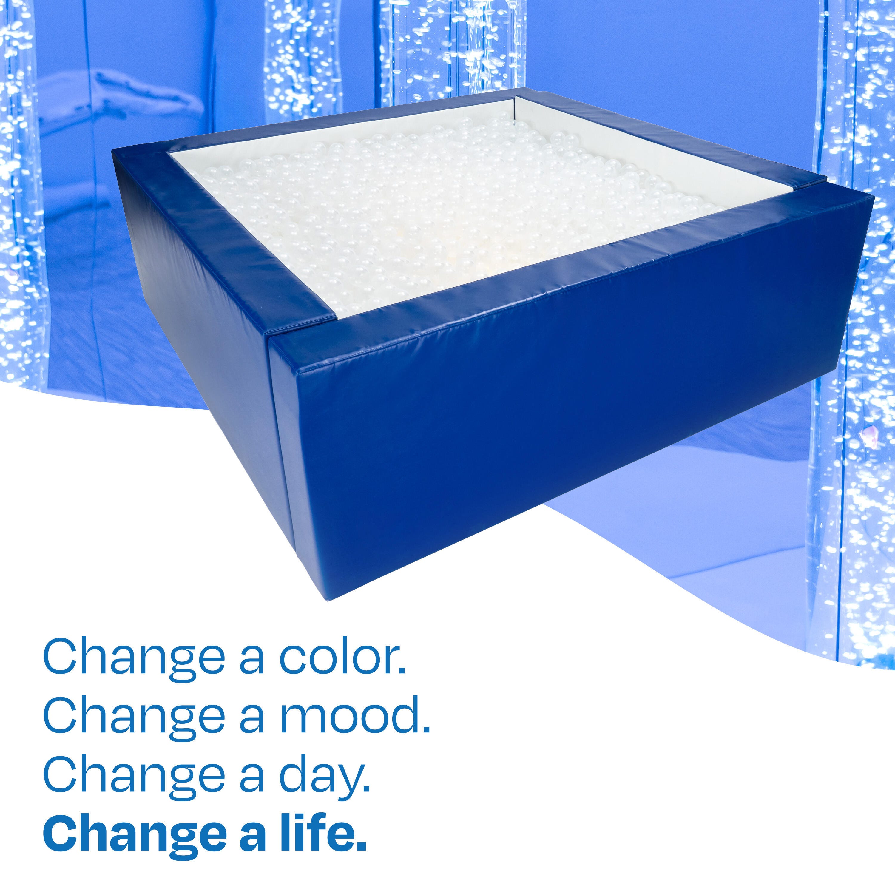 Watch the color of the balls change as you lie in the vibrating ball pool. Colors change through the clear balls creating a fascinating, relaxing experience. Balls sold separately. The interior is white with a dark blue exterior. The ball pool measures 7 feet x 7 feet x 2 feet 4-1/4 inches.
