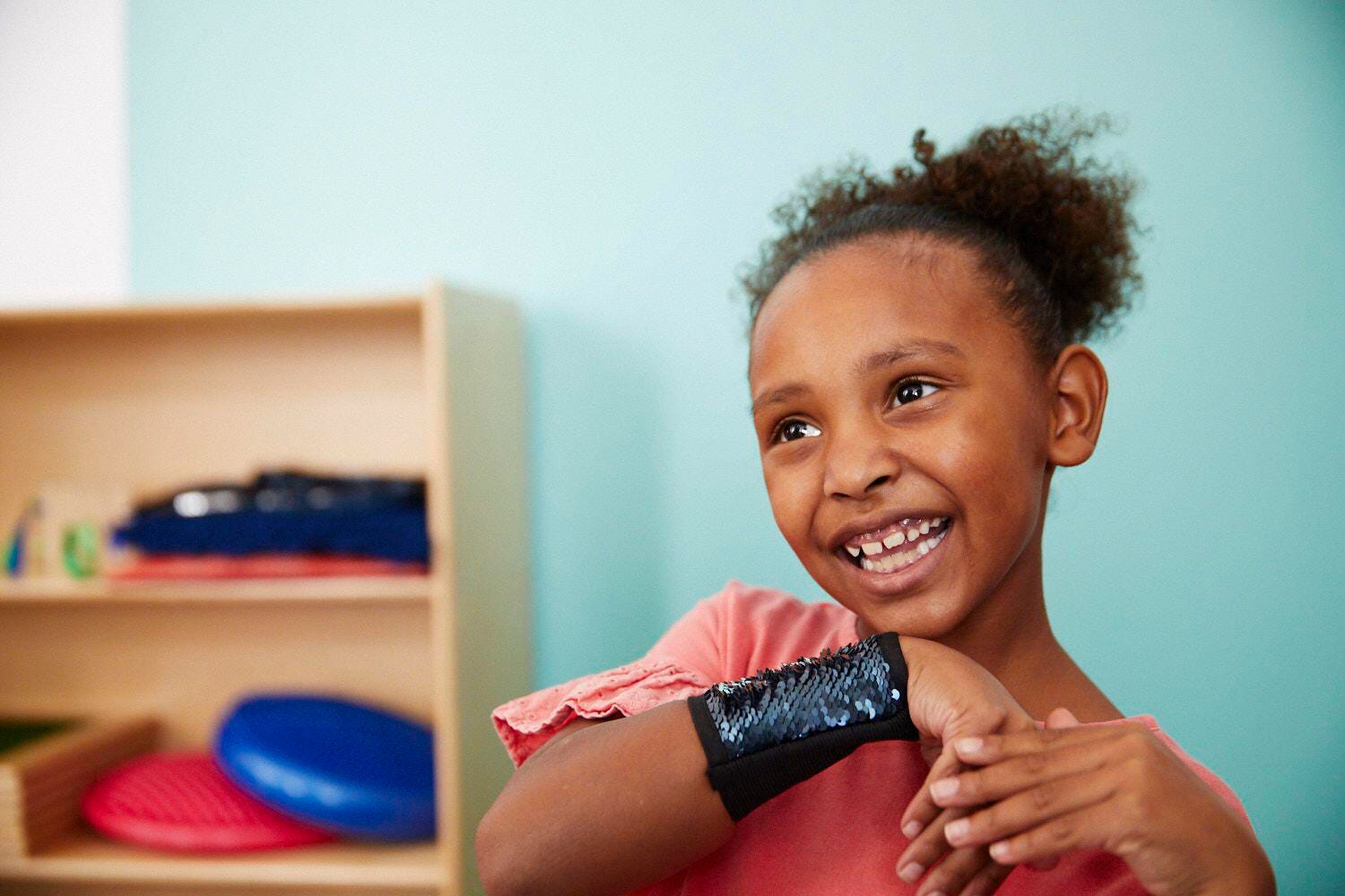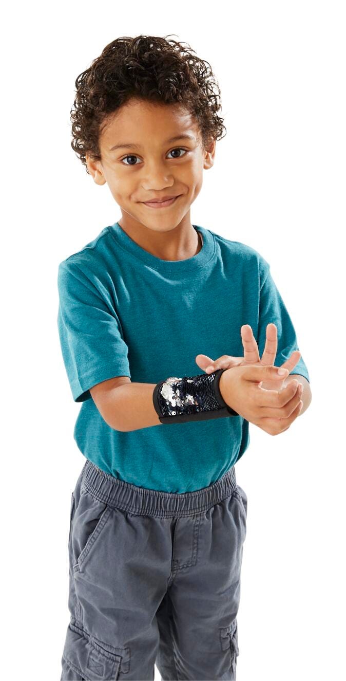 Fidget in a stylish way with this Abilitations Sensory Sequin Sleeve! Sleeve features reversible sequins that easily flip over with a swipe of a hand. Wear this brilliant bracelet to use as a calming aide or as a fine motor fidget. Not only it is visually appealing, the sleeve creates sensory feedback via touch. Sleeve measures 4 inches long and 2 inches in diameter. Elastic back makes for an easy, comfortable fit. Hand wash clean and line dry only. Appropriate for ages 4 years and up. Use with adult supervision.