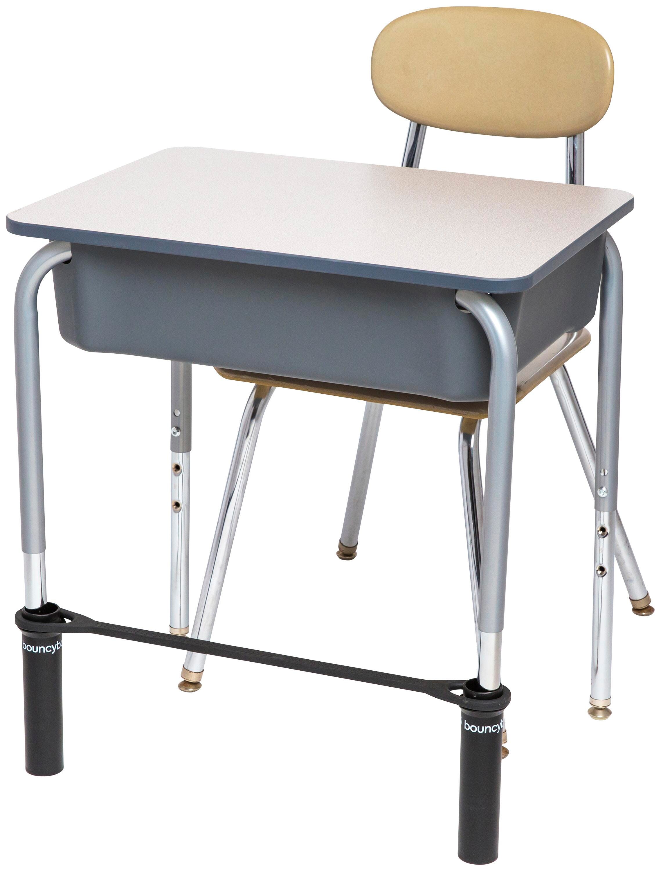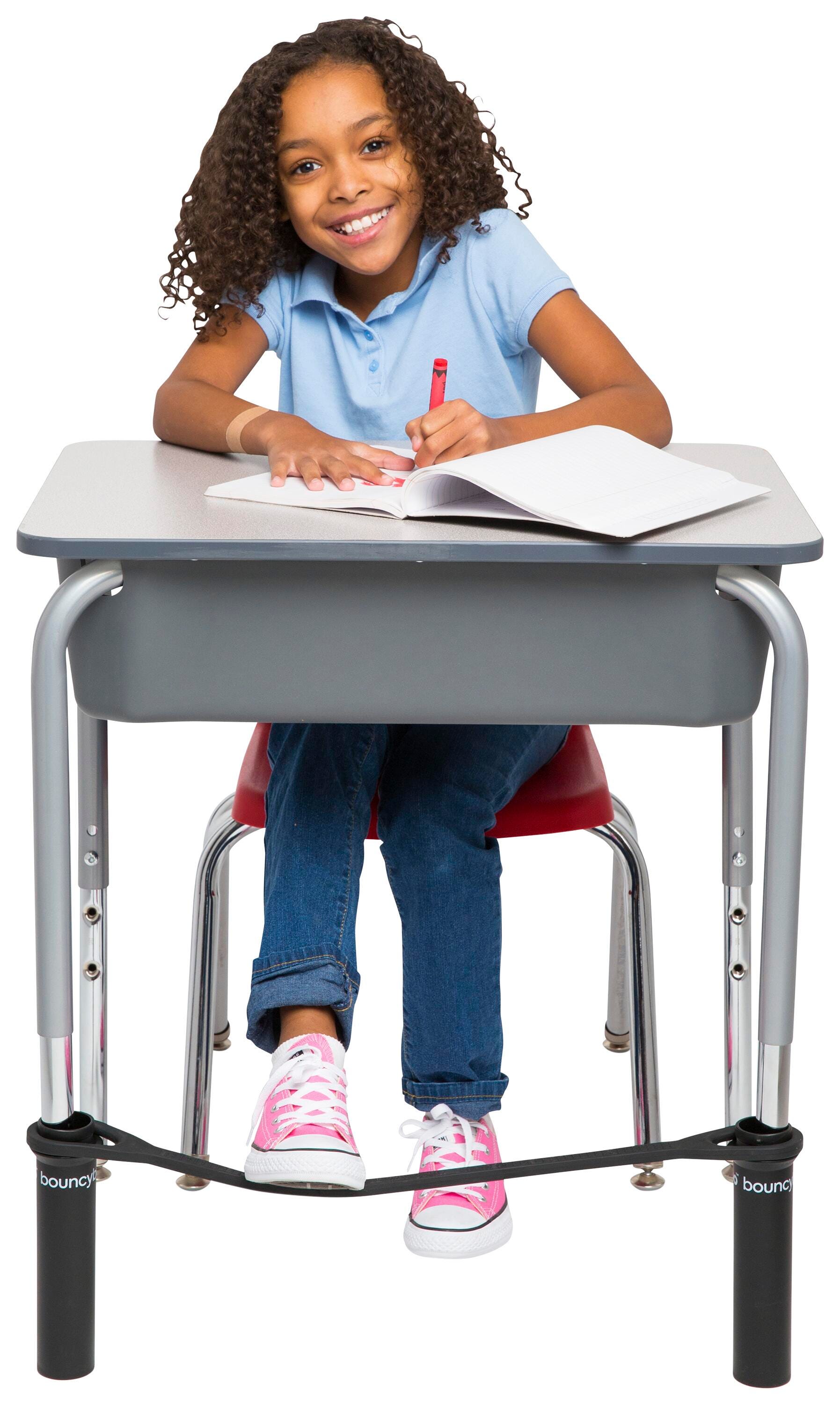 Bouncybands let students wiggle while they work! By resting and bouncing feet while sitting, the user is able to release extra energy and anxiety; increasing focus and promoting productivity. The 20 inch long, heavy-duty bands stretch up to 28 inches between desk legs to help children, teens and adults fidget without distracting others. The 8 inch high, super strong plastic support pipes keep the bands from sliding down to the floor. Individual desks can be moved around while in use. Installs easily in just a few seconds. Latex and phthalate free.Features