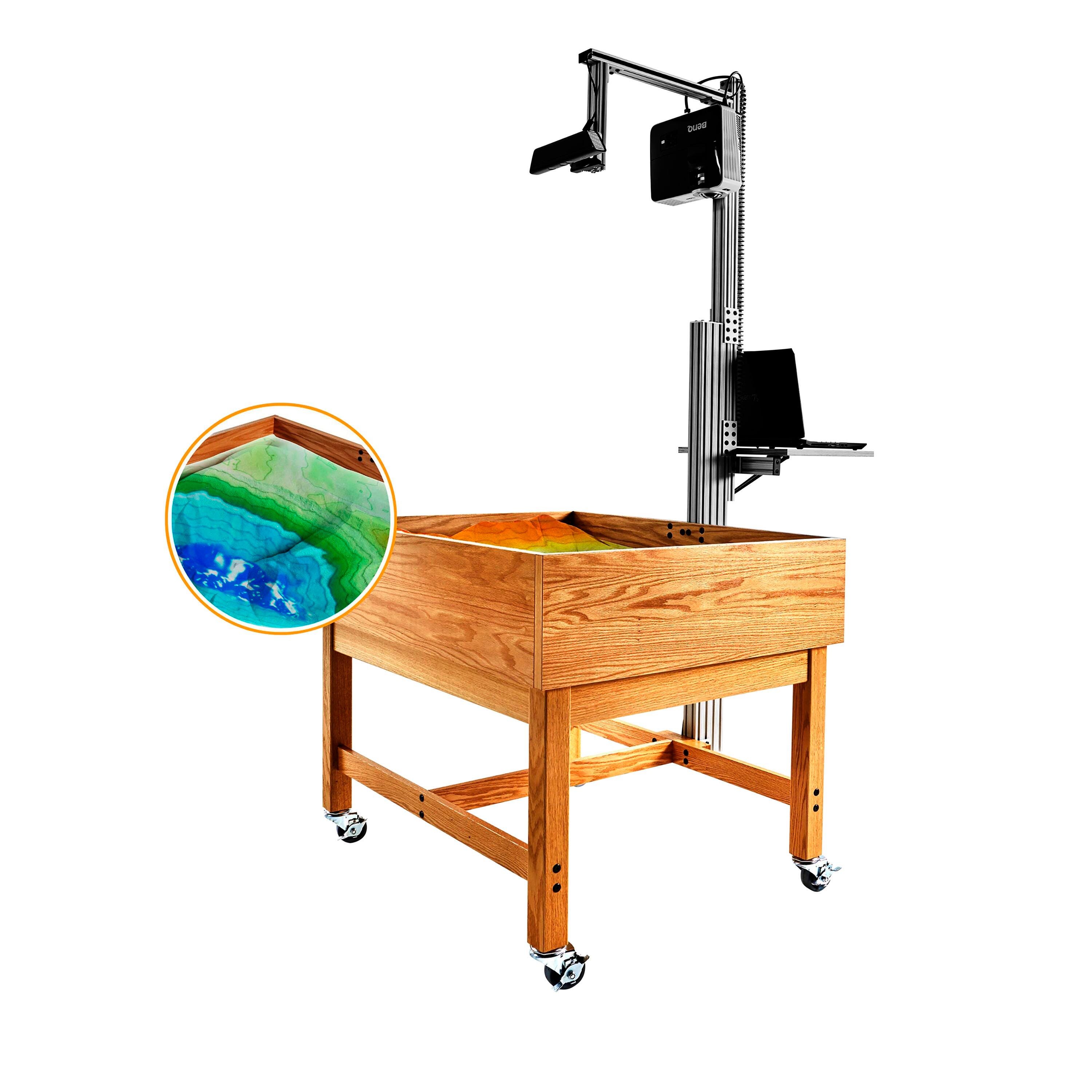 This interactive sandbox uses 3D visualization to combine the sandbox experience with virtual topography and water for a more engaging play experience. This high-tech educational play solution allows users to create topography models by shaping real sand, which is then augmented in real-time by an elevation color map, topographic contour lines, and simulated water. The system teaches students how to read a topography map, the meaning of contour lines, watersheds, catchment areas, levees, and much more. Renders use a closed loop of a Microsoft Kinect 3D camera, powerful simulation and visualization software, and a data projector. The software was designed by a team of scientists at UC-Davis. A wire management system keeps the cords from interfering with the box. Shelf to hold the laptop while in use, which folds away with a collapsible hinge. The 36-inch dimension measures to the top of the table. Sand not included. We recommend six orders of item 1601030 for 300 pounds of sand.