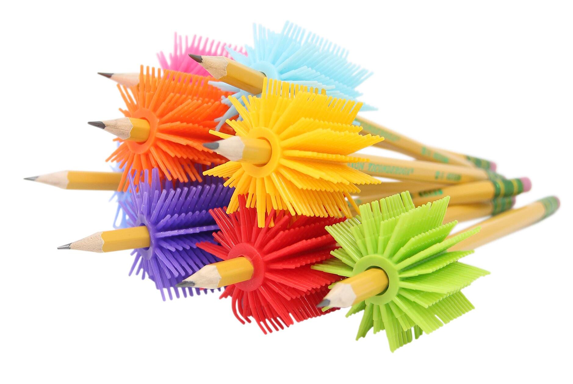 See a "spike" increase in attention (and smiling faces) with Fidget Tactile Pencil Grippers. Add this tool to a pencil and twist, twirl, and squeeze for a comfortable, more correct handwriting experience; or simply squish in the hand to release stress or get out those wiggles/fidgets. Gripper adds weight and girth/thickness to a #2 pencil, all while helping to control handwriting and strengthen the fingers for overall fine motor skills. Kinesthetic learners and those with special needs (like AD and ADHD, Sensory Processing Disorder, and more) will greatly benefit from these fun and irresistibly-fun-to-touch grippers. Sold as set of 6 in assorted colors. For ages 6 and up.Features