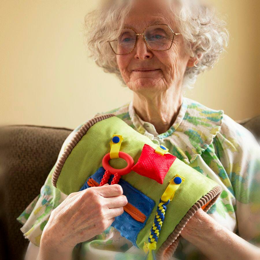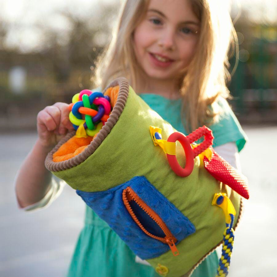 A cozy and inviting fidget with lots of fiddling options and a colorful, plush base.