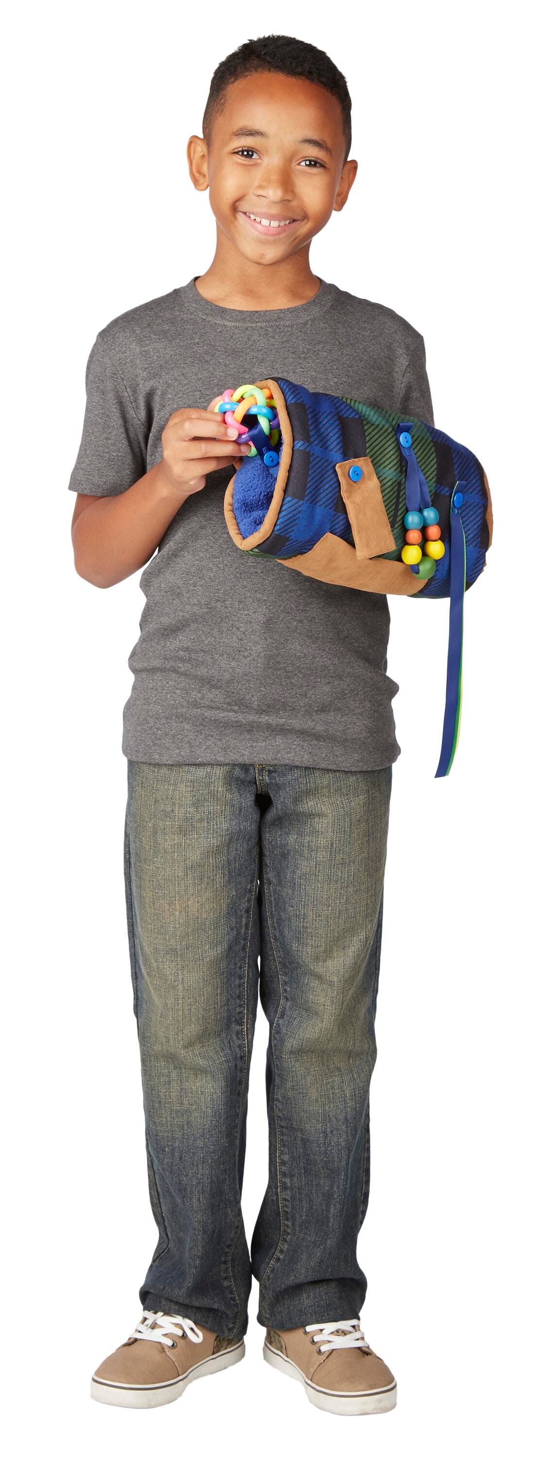 For the sports-minded, the streamlined, distinctive TwiddleSport is the way to go. Kitted out in Black Watch plaid with buckskin accents, the Sport model features mental and physical activity winners: strands of textured ribbons, a loop of multi-colored wooden beads, a sealed buckskin crackle pouch, a hook & loop pull patch, and an interior soft-plastic orbit ball to work on. No sweat stains or sore muscles, just therapeutic comfort or activity as needed. Machine-washable and dryer-friendly when all gadgets are removed. Measures 10 x 9 x 7 inches.