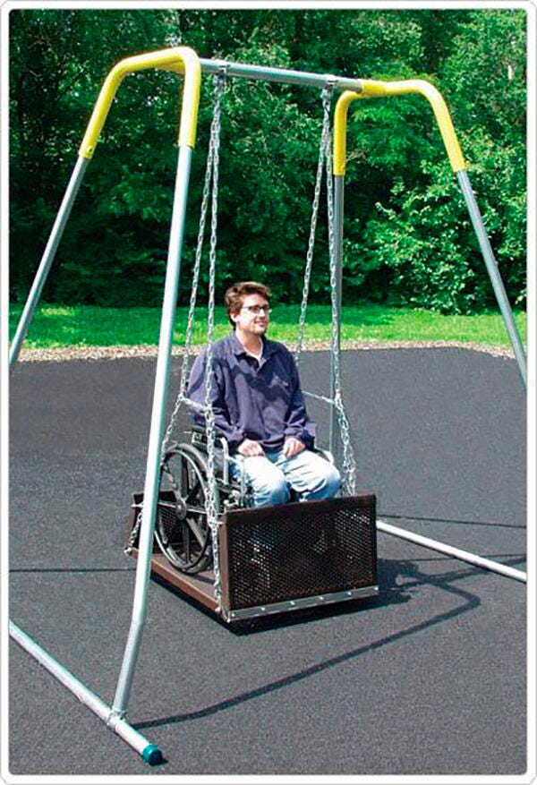 SportsPlay Equipment Wheelchair Portable Swing Frame is equipped with 360 degree lubricated swing bearing swivel. Frame is constructed of 2 to 3-3/4 inch outer diameter and 1-7/8 inch outer diameter galvanized pie with plastic floor protectors. To safely use, set up frame in an area measuring 20 x 32 feet. Frame has a weight capacity of 800 pounds. Frame only, swing base sold separately.