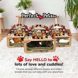 These adorable life-like animals offer a pet companionship experience that all ages can enjoy, without the hassle and responsibilities of caring for a real pet! Each pet "breathes" and their 100% synthetic fur is soft to stroke as they rest in your lap. Pets will breathe continuously for approximately 3-4 months by using the alkaline D battery (included) - possibly longer should you disconnect the battery between uses. No on-off switch. Clean only with a soft cloth lightly dampened with water to keep neat and tidy. Black lab plush measures 9-1/2 L x 7 W x 3 H inches. Carrier box measures 11 L x 7-3/4 W x 5 H inches flat, and 11 L x 7-3.4 W x 9 H inches when tent is up. Bed measures 13 L x 10 W x 2 H inches.Features