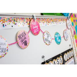 - Round, colorful Confetti Positive Sayings bulletin board acessories are ready to brighten displays, frame doorways, add edging to party tables, and beyond