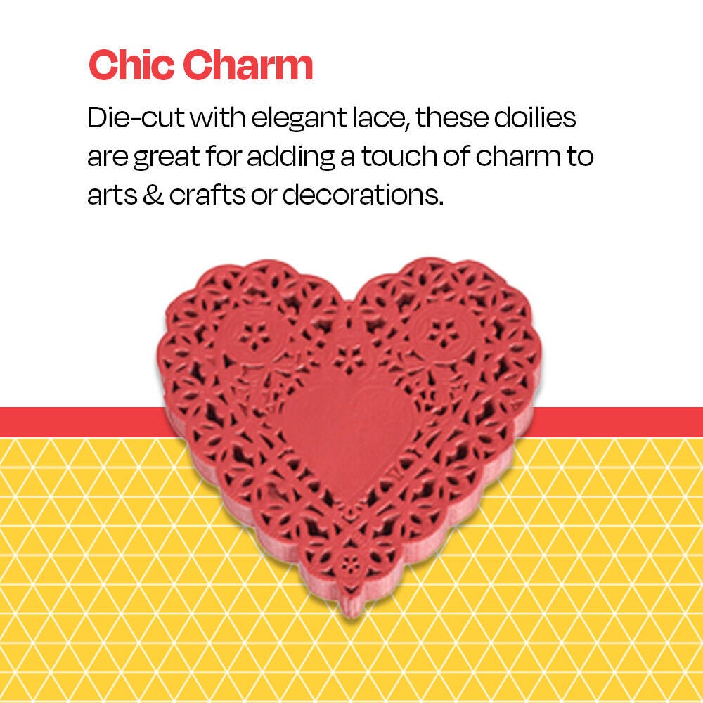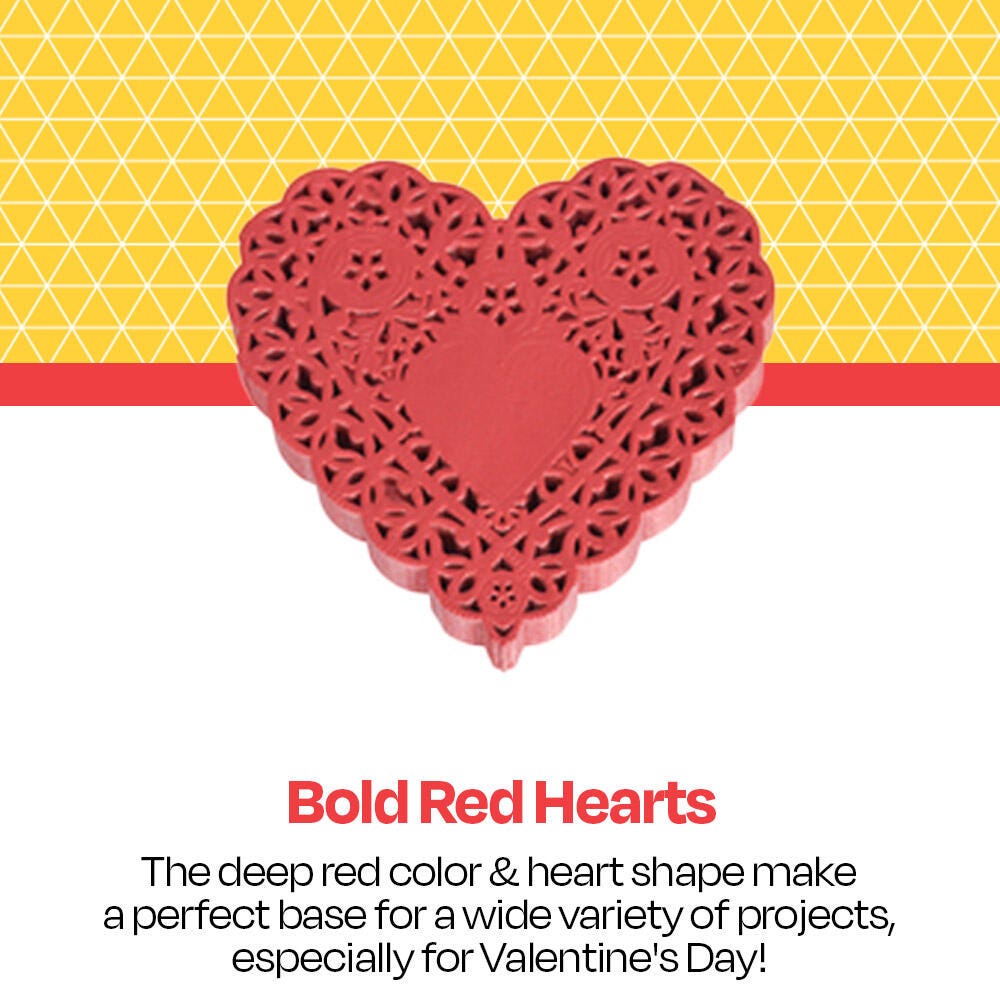 Add a touch of red elegant lace charm to Valentine's Day, paper crafts, or decorations with this value pack of 100 School Smart heart-shaped doilies!