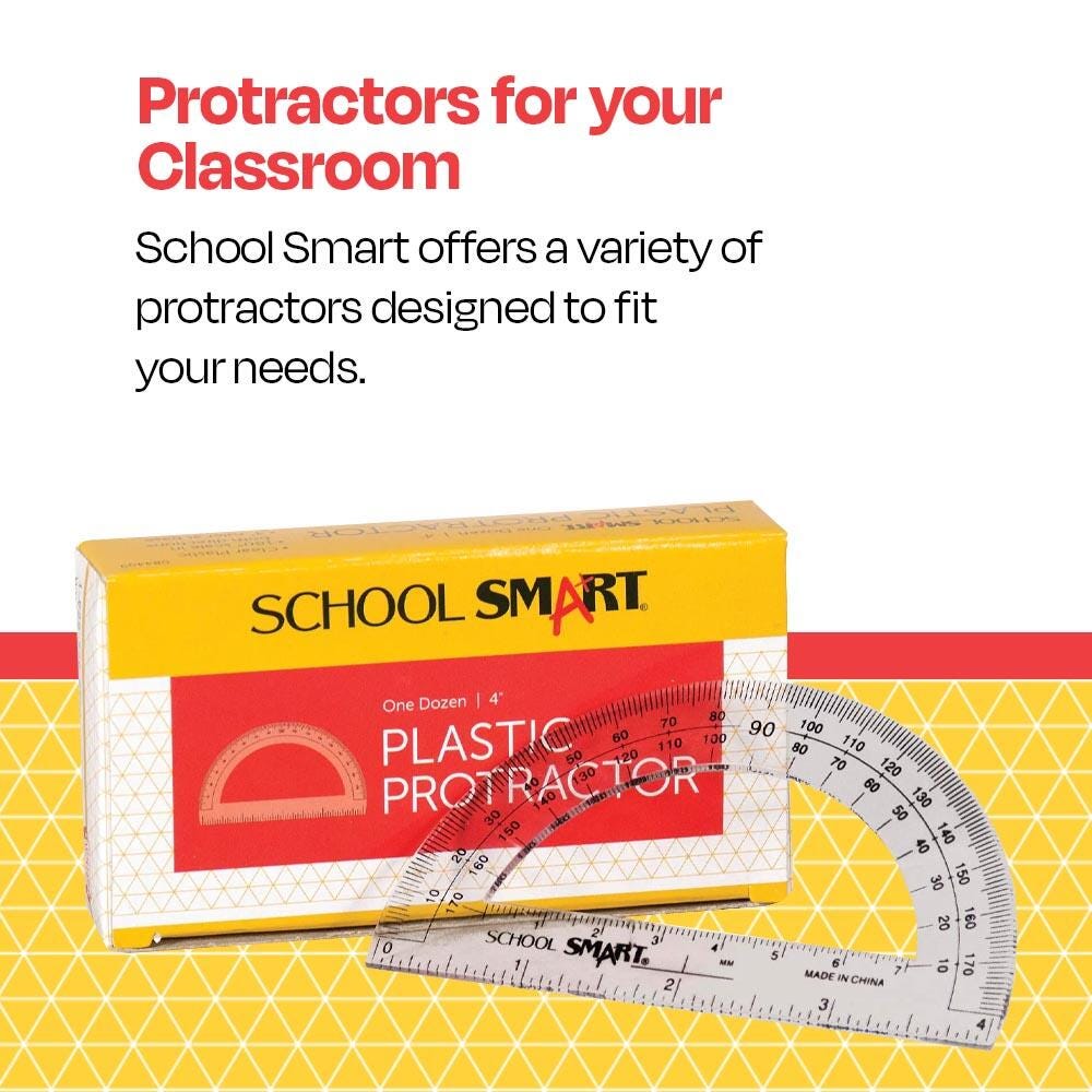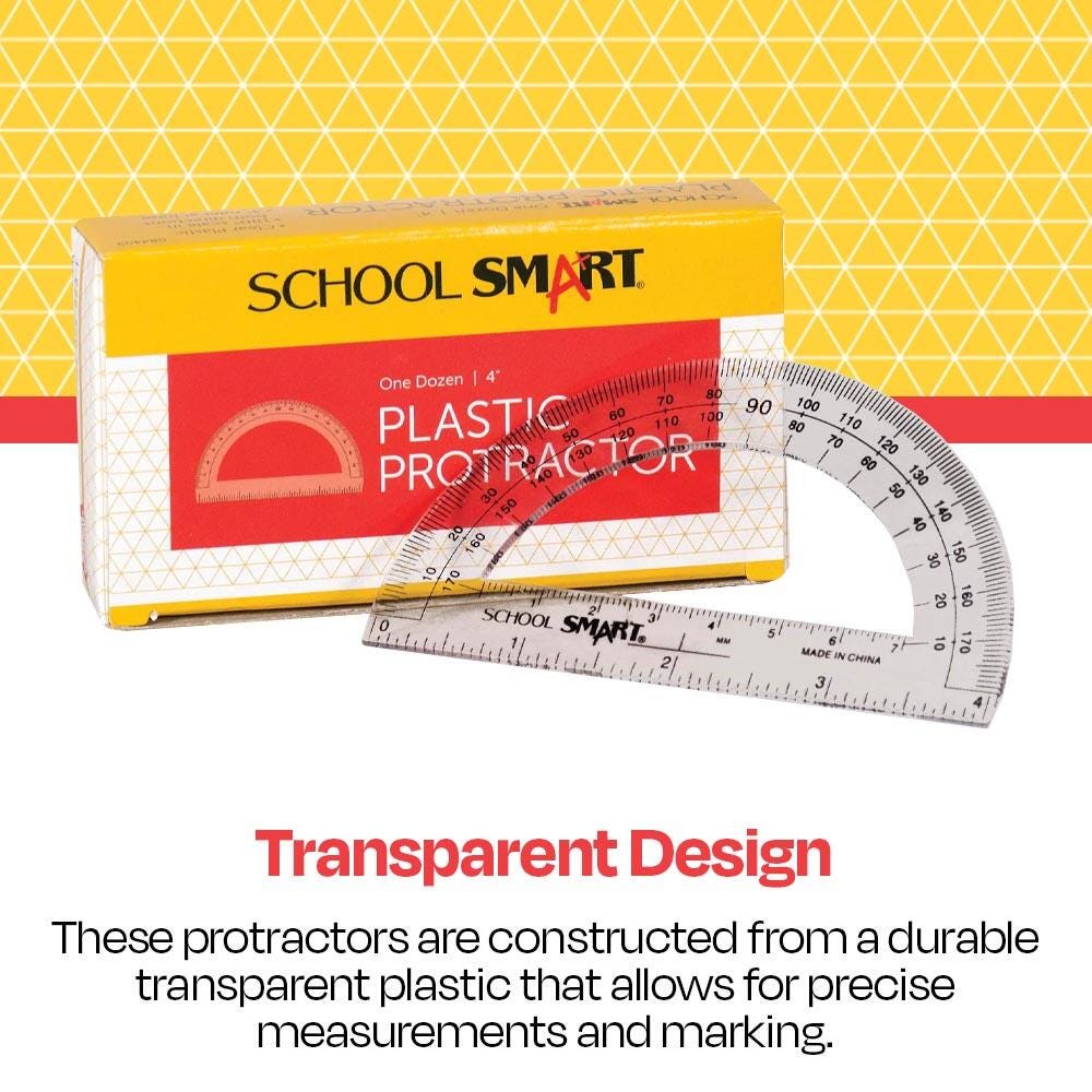 School Smart plastic protractors are clear and measure 4 inches. Each see-through protractor displays and measures varying angles such as 30, 45, 60, and 90 degrees. Plot angles from 0 to 180 degrees left to right and right to left for school projects and more.