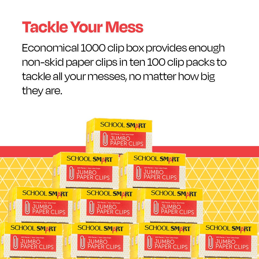Transform your workspace with the School Smart Non-Skid Paper Clips made from the highest quality steel and perfect for home, school or office. These 2 inch jumbo clip feature a bright, corrosion-resistant finish. The paper clip is treated to eliminate skidding so that your clipped documents will stay together. Sold as a total of 1000 paper clips that are separated into 10 packs of 100 paper clips each.