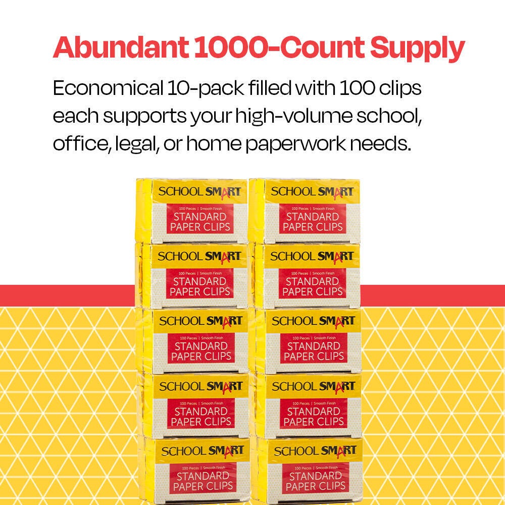 The Smooth Paper Clips from School Smart are a high-quality, affordable solution for daily organization in the classroom, office, or home. Each clip measures 1-1/4 inches and is made from the highest quality steel with a bright, corrosion-resistant finish to provide reliable and lasting use. They are perfect for grouping completed paperwork, compiling receipts, organizing important files, and much more. This pack delivers a total of 1,000 paperclips, with 10 boxes containing 100 each, so you can stock your supplies for numerous future projects.