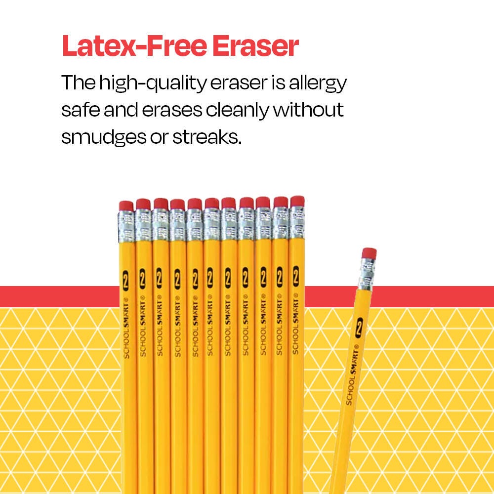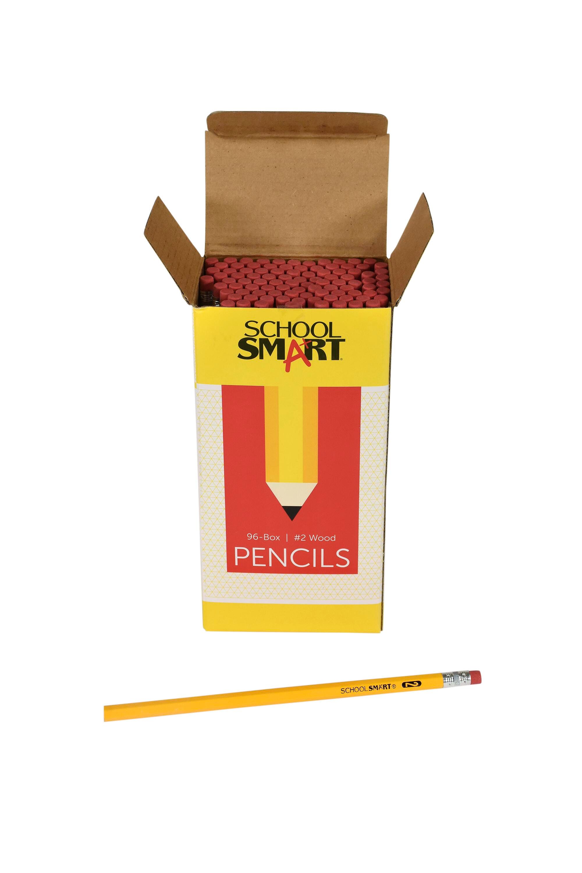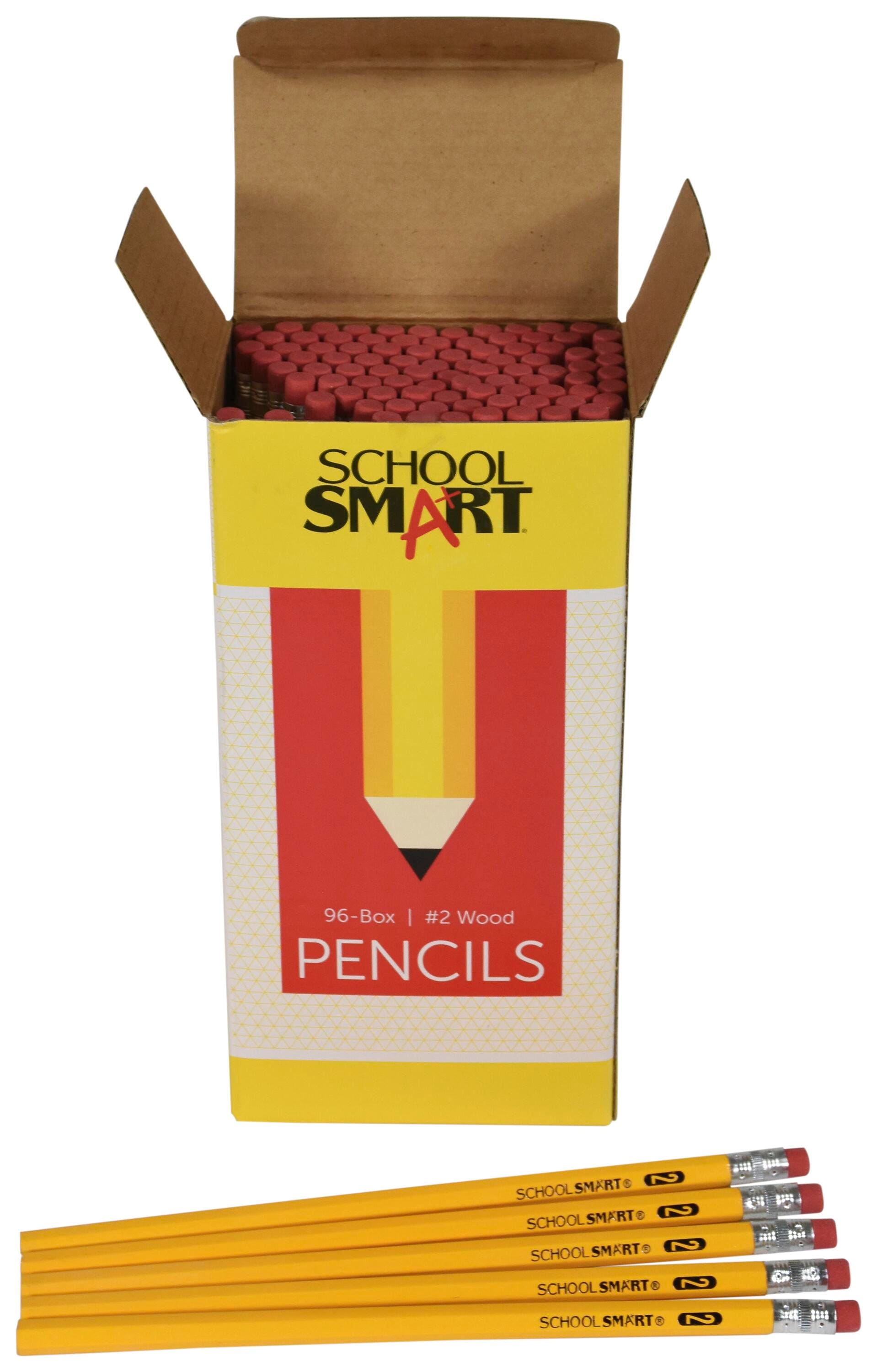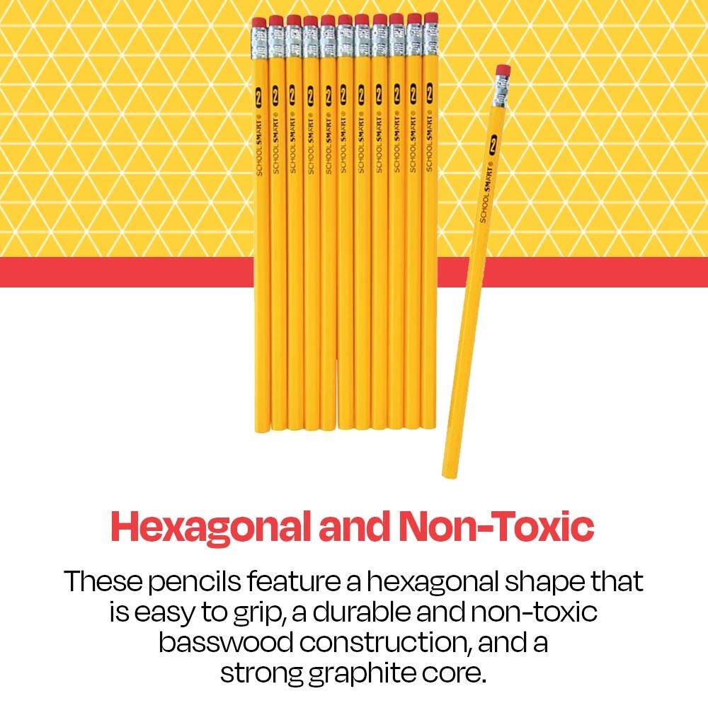 The School Smart No 2 pencils bulk pack features hexagonal-shaped pencils for a better grip and roll-away resistance. Our yellow pencils are made from basswood (comparable to cedar, but more economical) and the strong, lead-free graphite core provides smooth, visible writing. The non-toxic No 2 pencils allow for effortless sharpening and have a latex-free eraser attached. These traditional pencils do not come pre-sharpened and are sold as a pack of 96.