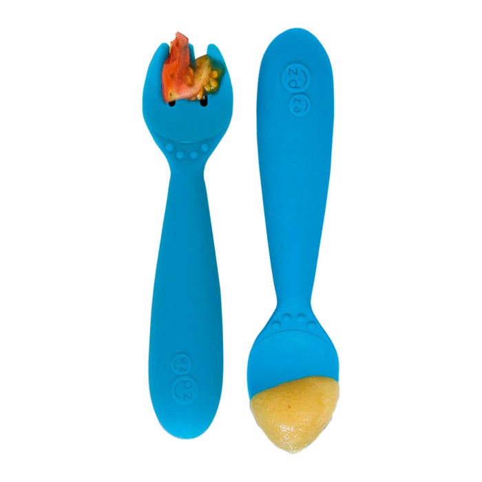 Learning to self-feed is an important developmental milestone, and the ezpz Mini Utensils are designed to help toddlers learn how to eat with a spoon (scooping) and fork (piercing). The Mini Spoon and Fork are the most functional, developmentally appropriate toddler utensils on the market. Sensory bumps and raised rim provide sensory awareness. Non-slip grip and short, fat, round handle make grasping more successful. Utensils are made with food grade silicone and nylon (BPA, BPS, PVS, phthalate and latex free) and are Dishwasher safe. Dimensions of spoon and fork are 4-3/8 L x 1 W inches. Appropriate for ages 12 months and up.Features