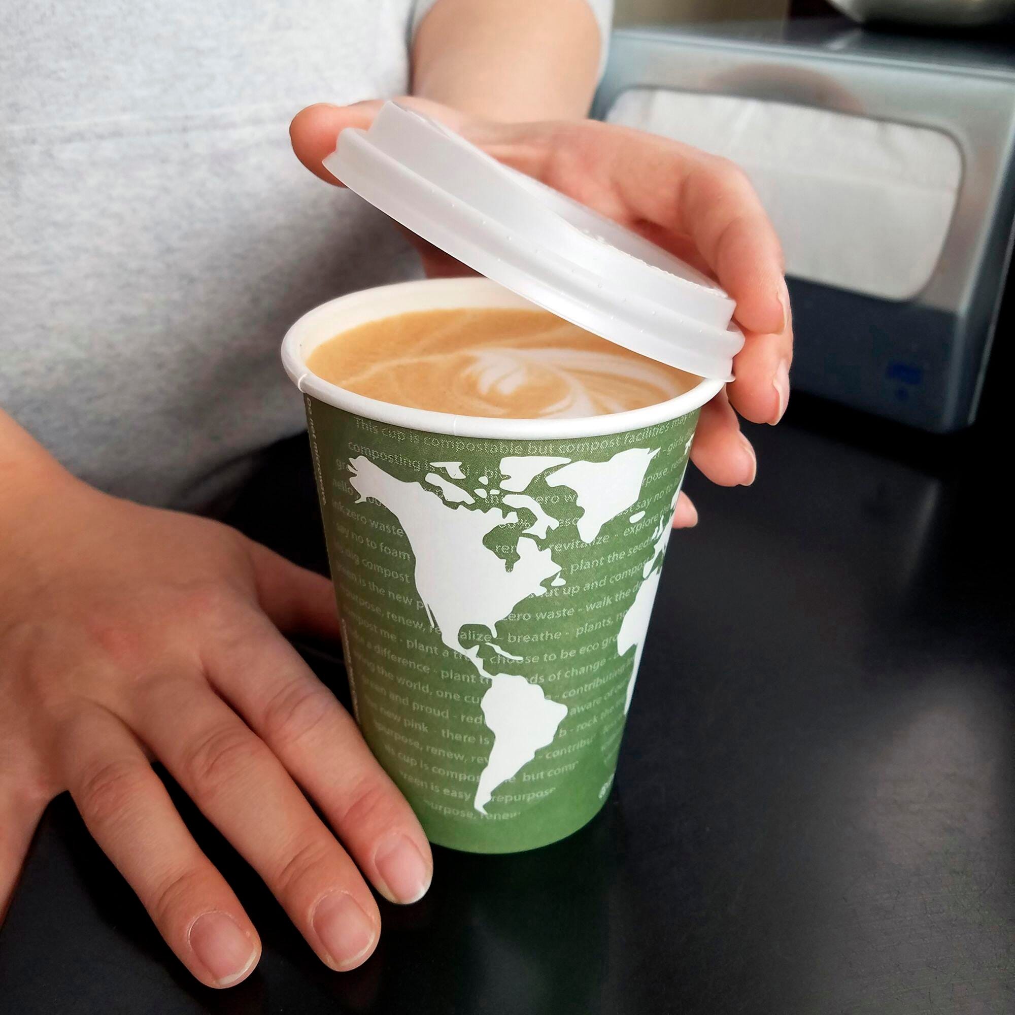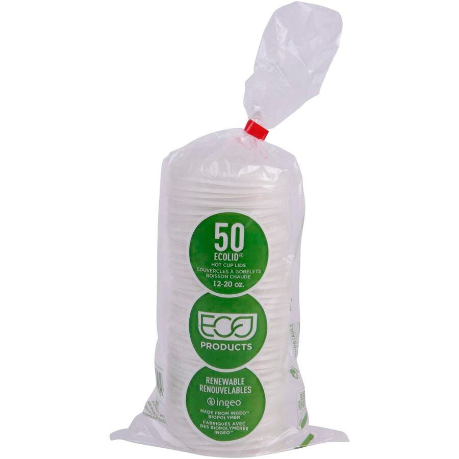 Eco-Products Renewable EcoLid Hot Cup Lids are made with PLA, a plant-based material, instead of traditional oil-based plastics. Traditional plastics are made from petroleum, the world's most valuable, nonrenewable resource. Polylactic acid (PLA) or "corn plastic" is made from annually renewable resources, not oil. Crystalized formulation adds strength and heat tolerance. The EcoLid is specially designed to top off hot beverages and prevent leaking. 100 percent renewable lid offers a heat tolerance of 200 degrees Fahrenheit and fits 10 to 20 oz. cups. 50 white lids per pack. 16 Packs per carton. This item is Eco Friendly.