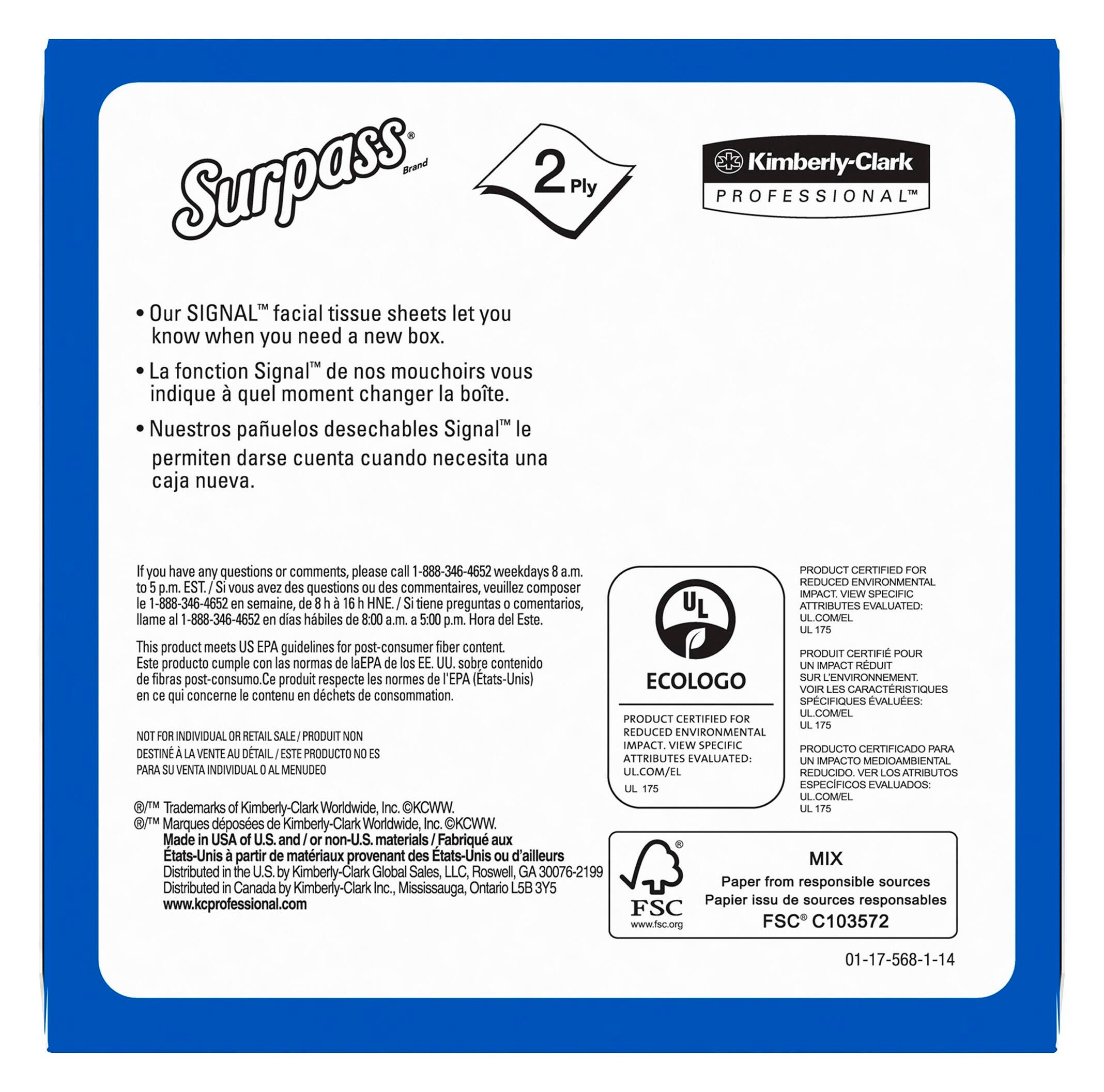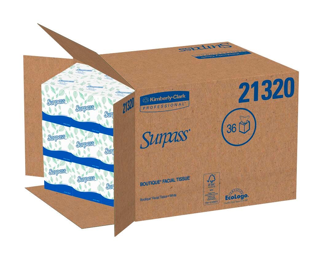 Kleenex Surpass Boutique Facial Tissue is suitable for wiping various skin surfaces that helps to prevent the spread of germs and bacteria. Tissue offers combination of value, softness and two-ply strength for optimum comfort. White. Sold as 36 per box. Meets EPA standards for minimum post-consumer waste content and FSC Certified. This item is Eco Friendly.