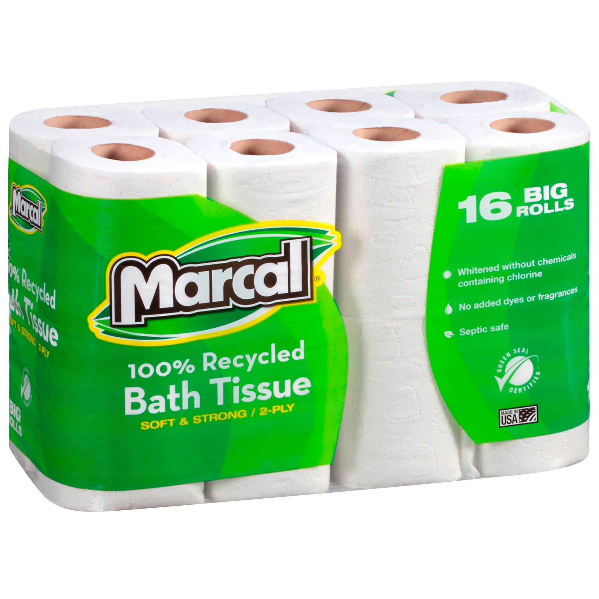 Marcal Small Steps 2-Ply Premium Bathroom Tissue with pattern is designed for softness. White tissue is made from 100% recycled content with 60% post consumer materials. Septic-safe tissue is virtually lint free and roll of 168 sheets is sold as 16 per pack. This item is Eco Friendly. 4-1/3 in L X 3.67 in W. Fiber. White.Includes: