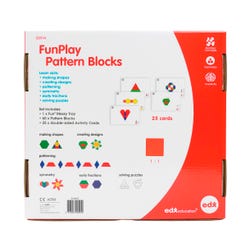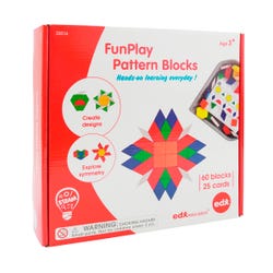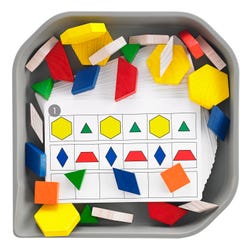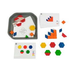This set includes 60 wooden pattern blocks in the 6 standard sizes and colors (yellow hexagons, orange squares, green triangles, red trapezoids, blue parallelograms, tan rhombuses), 25 double-sided activity cards and 1 Messy Tray. Perfect for math lessons, this kit includes symmetry, fractions object cards. Children can also follow the cards to make creative designs and solve puzzles. As children play, they will develop problem-solving, spatial awareness, fine motor, hand-eye coordination and logical thinking skills. Made with smooth, durable wood, these Pattern Blocks are made for young learners. Use the included Messy Tray to keep activities contained during play. Packaged in a sturdy cardboard box for easy cleanup and storage. Size of Messy Tray: 10 L x 10 W inches. Size of hexagon: 1.9 inches. Appropriate for ages 3 and up.Features