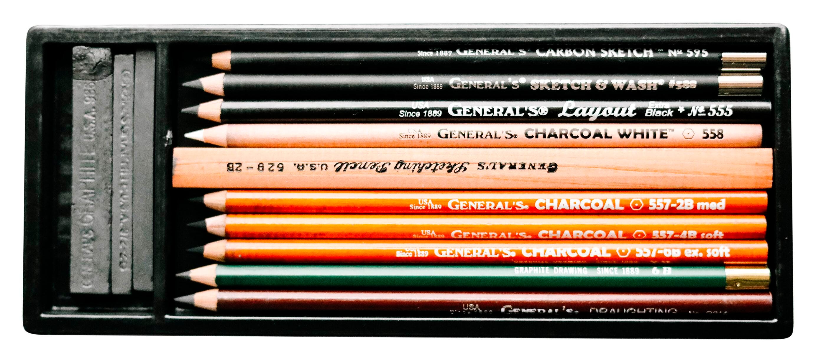 General's Drawing Pencil Kit contains 13 professional artist quality drawing tools. Ideal for art classes, travel, professional art, portrait drawing,mixed media and more. Includes: 1 Flat Sketching™ Pencil, 3 Charcoal Pencils (557-2B, 557-4B, 557-6B), 1 Charcoal White® Pencil, 1 Kimberly® Drawing Pencil (Soft), 1 Layout® Pencil (555), 3 Graphite Sticks (972-2B, 974-4B, 976-6B), 1 Sketch & Wash® Pencil (588), 1 Carbon Sketch™ Pencil (595), 1 Draughting™ Pencil (G314)Features