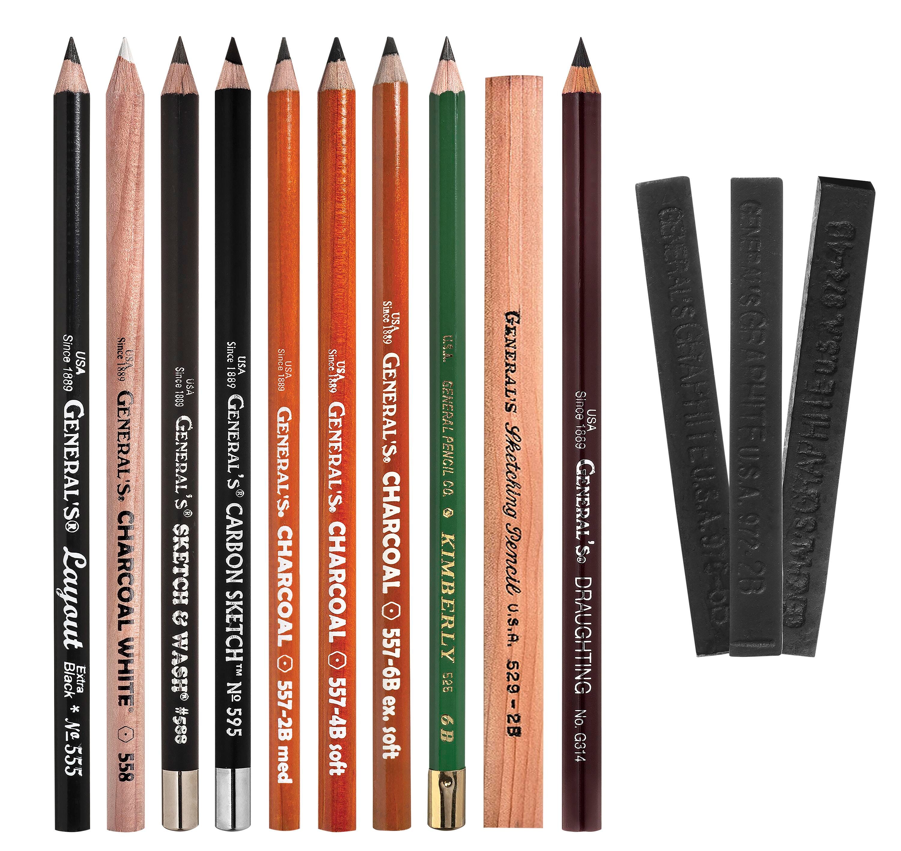 Made in the USA, Professional Artist Quality Drawing Pencils & SticksIncludes: 1 Flat Sketching™ Pencil, 3 Charcoal Pencils (557-2B, 557-4B, 557-6B), 1 Charcoal White® Pencil, 1 Kimberly® Drawing Pencil (Soft), 1 Layout® Pencil (555), 3 Graphite Sticks (972-2B, 974-4B, 976-6B), 1 Sketch & Wash® Pencil (588), 1 Carbon Sketch™ Pencil (595), 1 Draughting™ Pencil (314)