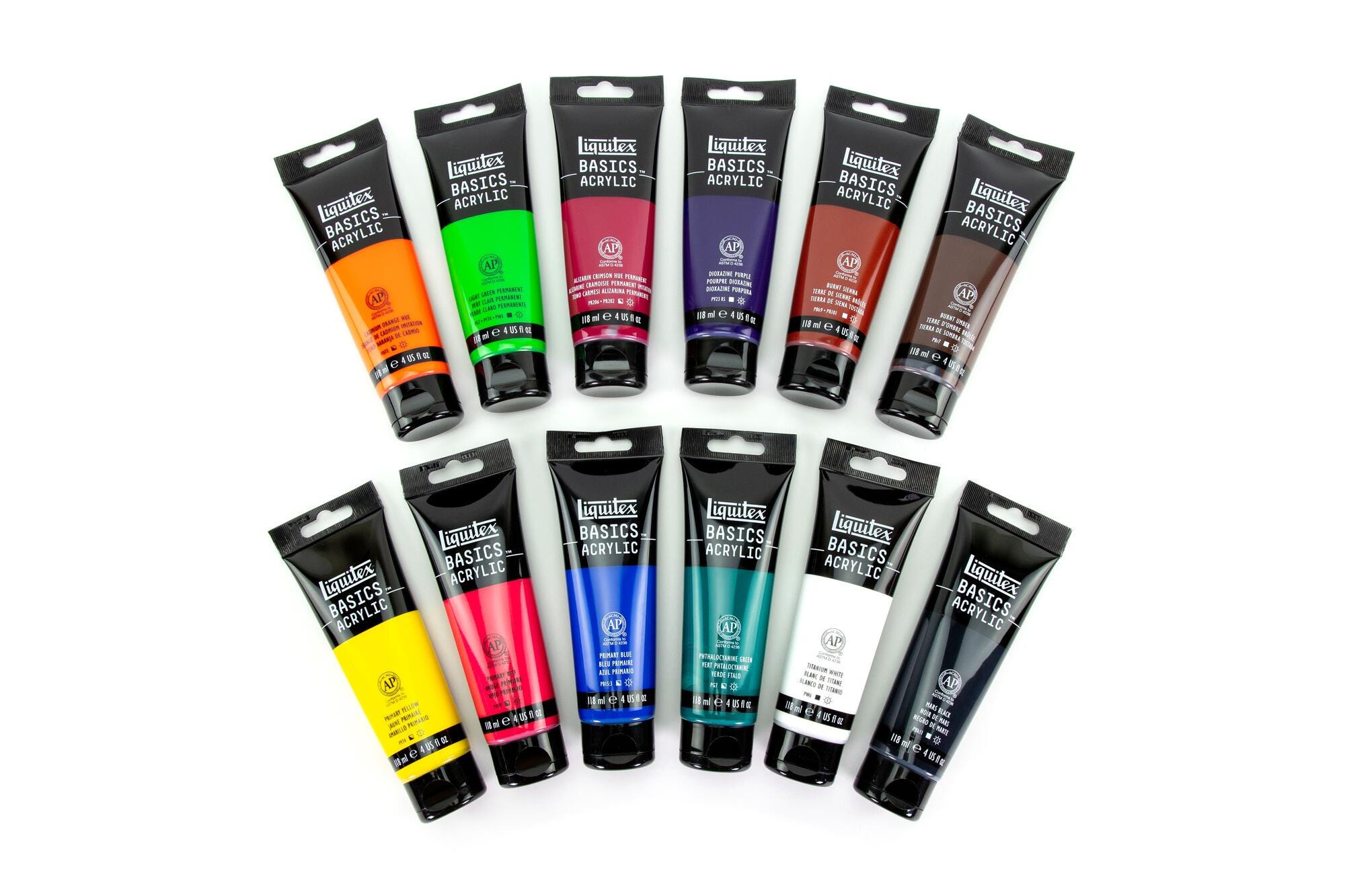 Liquitex Basics Acrylic Paint is for all artists, from new to experienced painters. This high-quality paint is perfect for beginners, or for creative pros that need budget-friendly materials for underpainting, sketching, or color scoping This medium viscosity acrylic is made with lightfast, artist-quality pigmentsm, and this set of 12 contains the following colors: Primary Yellow, Cadmium Orange Hue, Alizarin Crimson Hue Permanent, Primary Red, Dioxazine Purple, Primary Blue, Phthalocyanine Green, Light Green Permanent, Burnt Sienna, Burnt Umber, Titanium White, and Mars Black. Each tube contains 118mL.Features