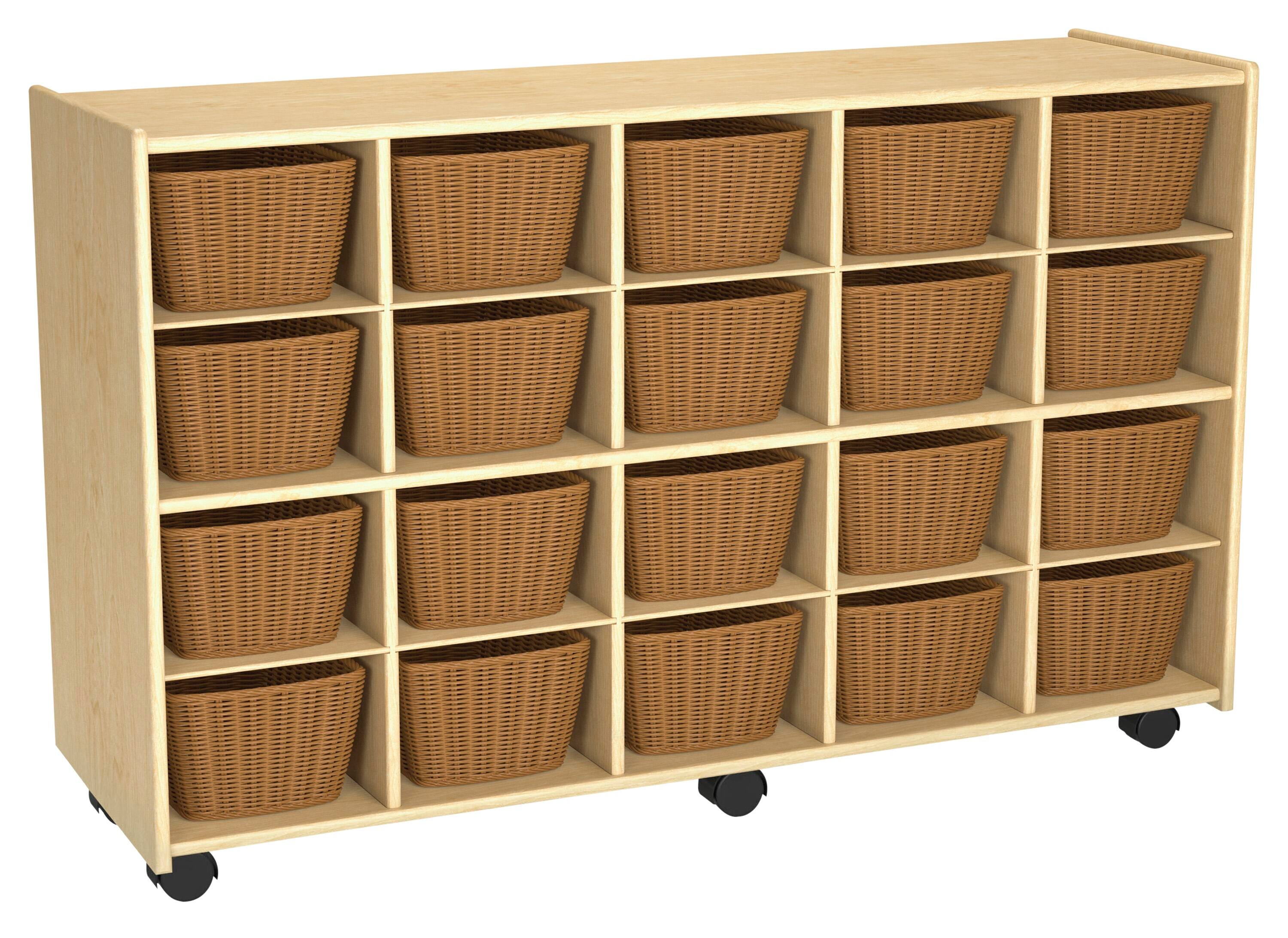 Childcraft Mobile Cubby Unit With Locking Casters, 20 Wicker Baskets, 47-3/4 x 14-1/4 x 30 Inches