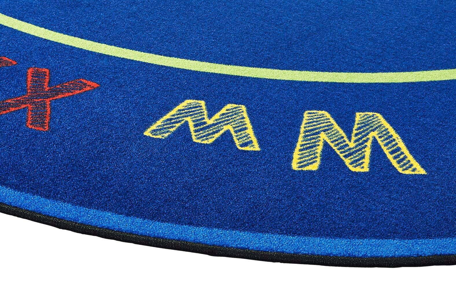 Chalkboard design to coordinate with your chic décor, this premium rug is ideal for classrooms, care centers, and playrooms. Blue background with colorful chalk-looking alphabet border promotes literacy in little learners with early letter recognition. Perfect as a seating carpet, this floor covering is designed to inspire playful storytime and circle time. Made with true stain blocker technology that makes clean-up a cinch using only hot water extraction with no harsh chemicals necessary. All of the fibers are completely saturated with the stain treatment. Available in several sizes to best fit your space. Please select the size that fits your space best when ordering.Features
