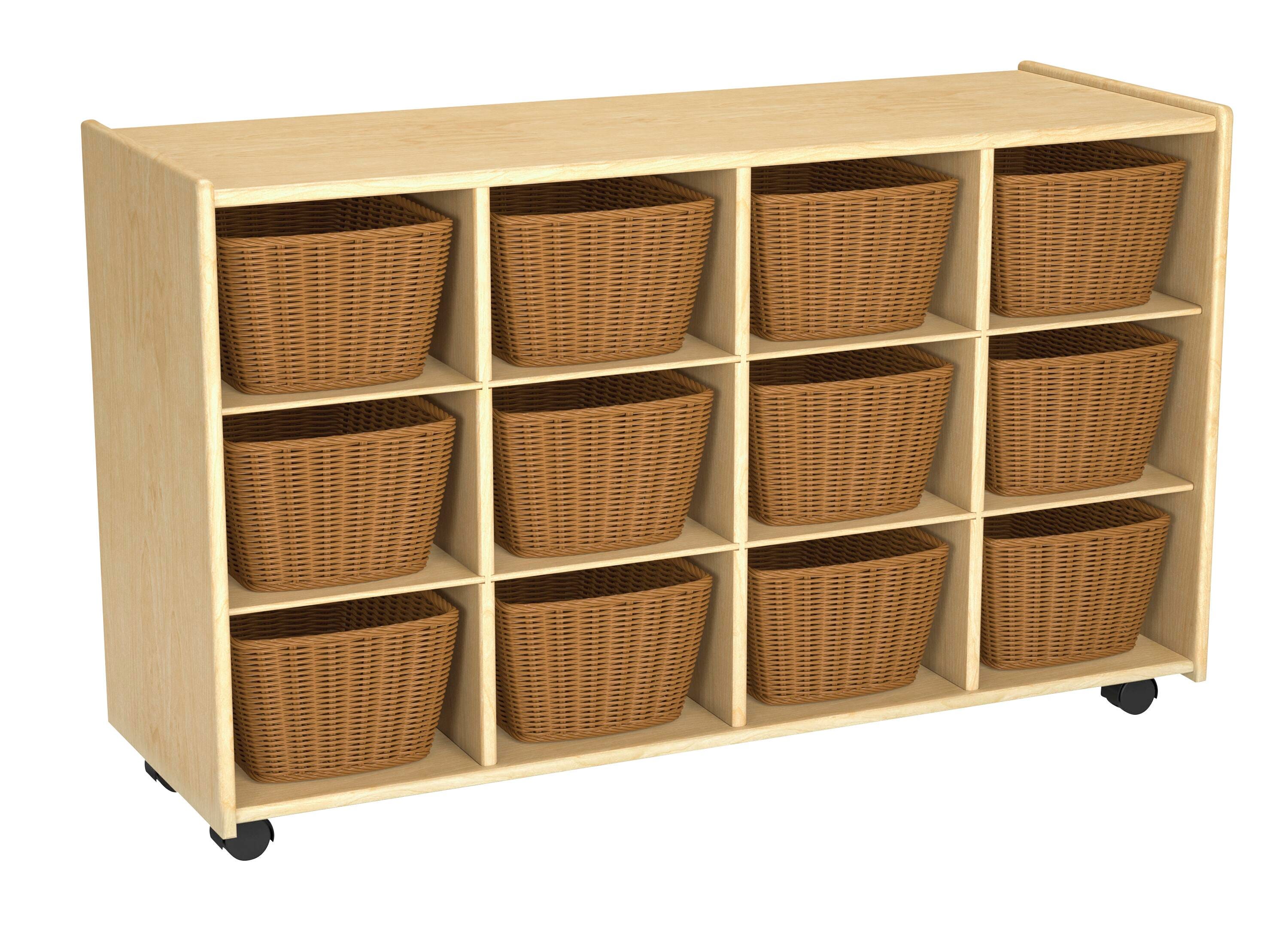 Childcraft Mobile Cubby Unit With Locking Casters, 12 Wicker Baskets, 38-5/16 x 14-1/4 x 24 Inches