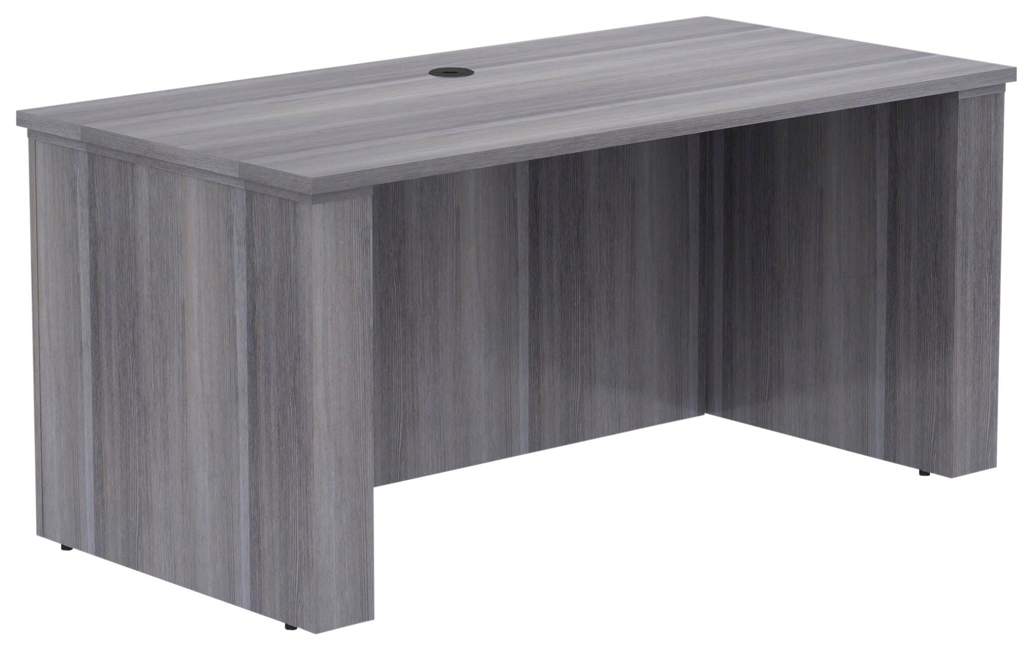 Focus while sitting or standing at this Sit-to-Stand Desk Shell made to meet you where you work best. Its high-quality laminate construction and metal-to-metal, cam-lock connections create a workspace that's both timeless and stable. Modern Weathered Charcoal laminate top is designed with 3-millimeter PVC edges to prevent peeling and is 1-inch thick for durability. Features a grommet for easy cord management. Designed with a full modesty panel for privacy and leg panels with adjustable feet. Measures 60 W x 29 D inches, with a height range of 27-1/2 to 47 inches.Features