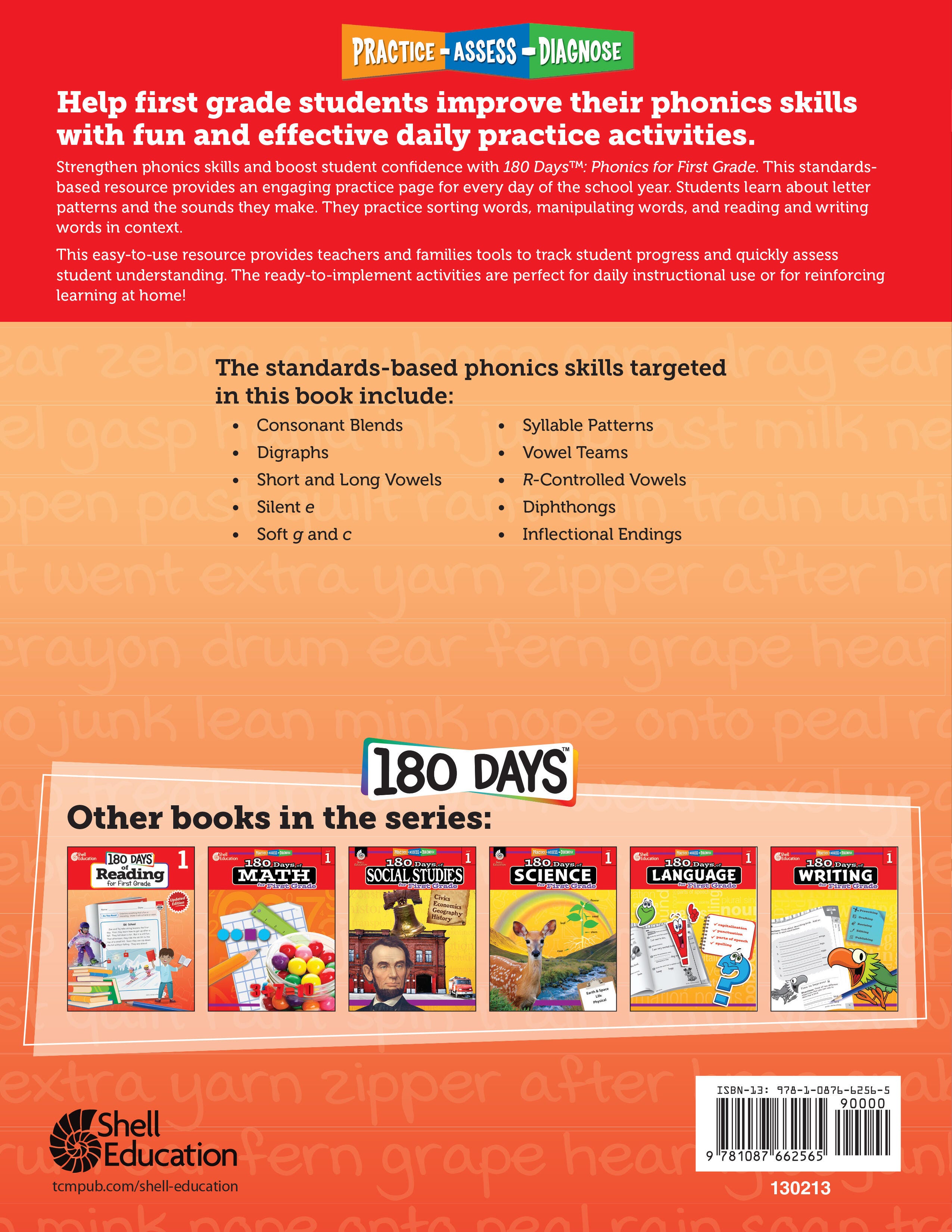 Shell Education delivers a fun and effective way to learn phonics, created by experienced educators! 180 Days™: Phonics offers purposeful practice designed to help first-grade students master the basics of phonics through a variety of fun and interactive activities. This workbook is packed with exercises that focus on letter recognition, sound identification, and basic word formation, all presented in a playful, visually appealing, and age-appropriate format. Great for homeschooling or classroom learning, these workbooks also help kids retain educational knowledge during the summer or stay-at-home learning periods. This workbook contains 240 pages of phonics fun!