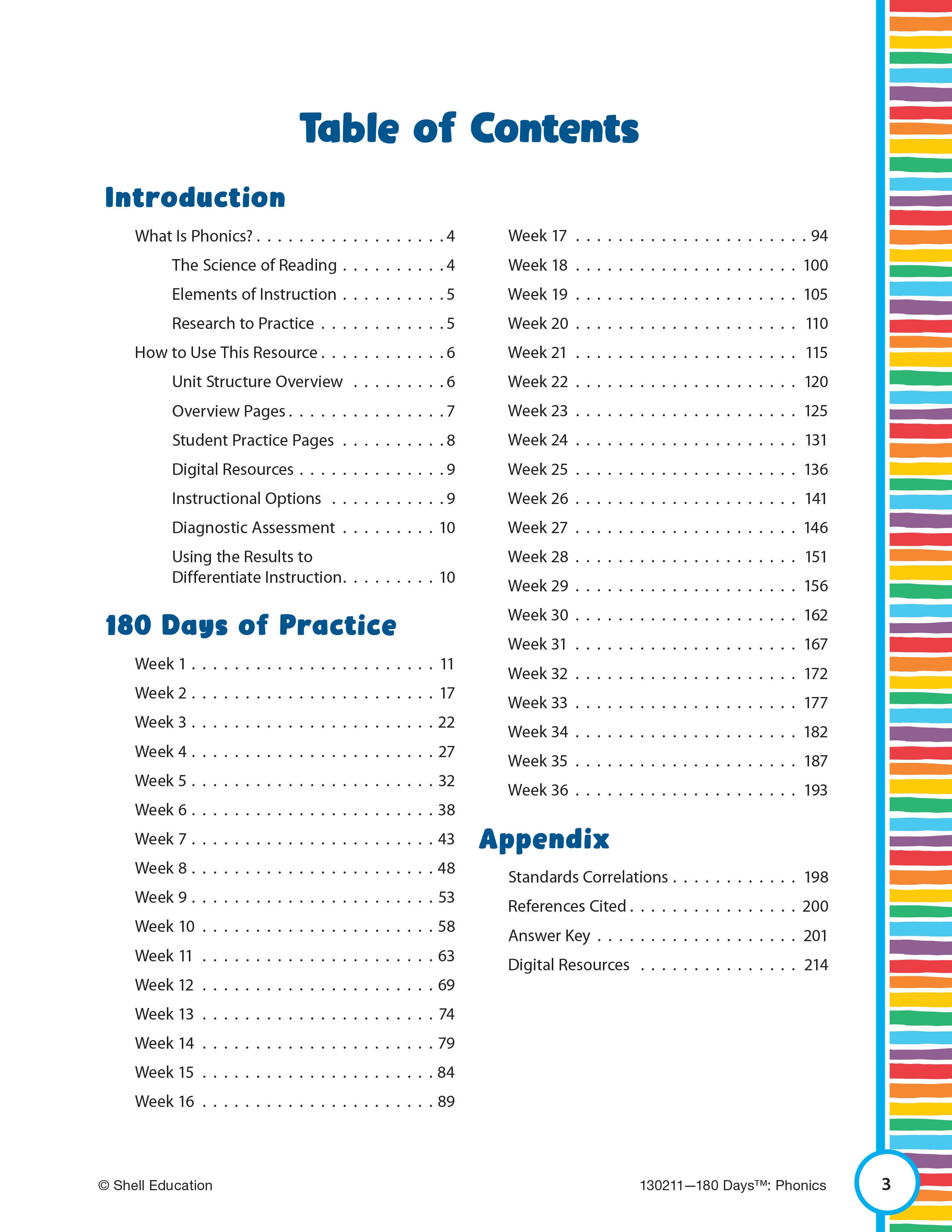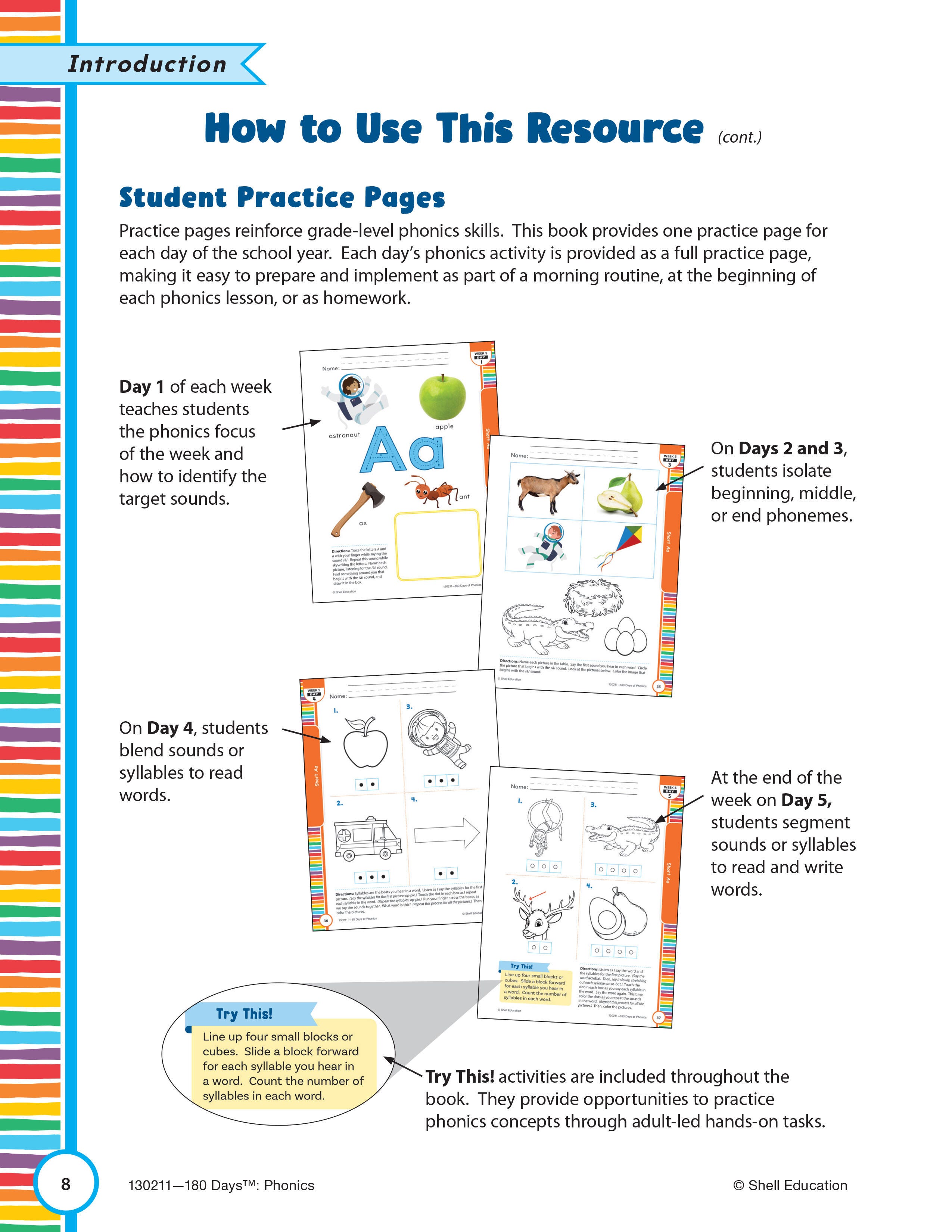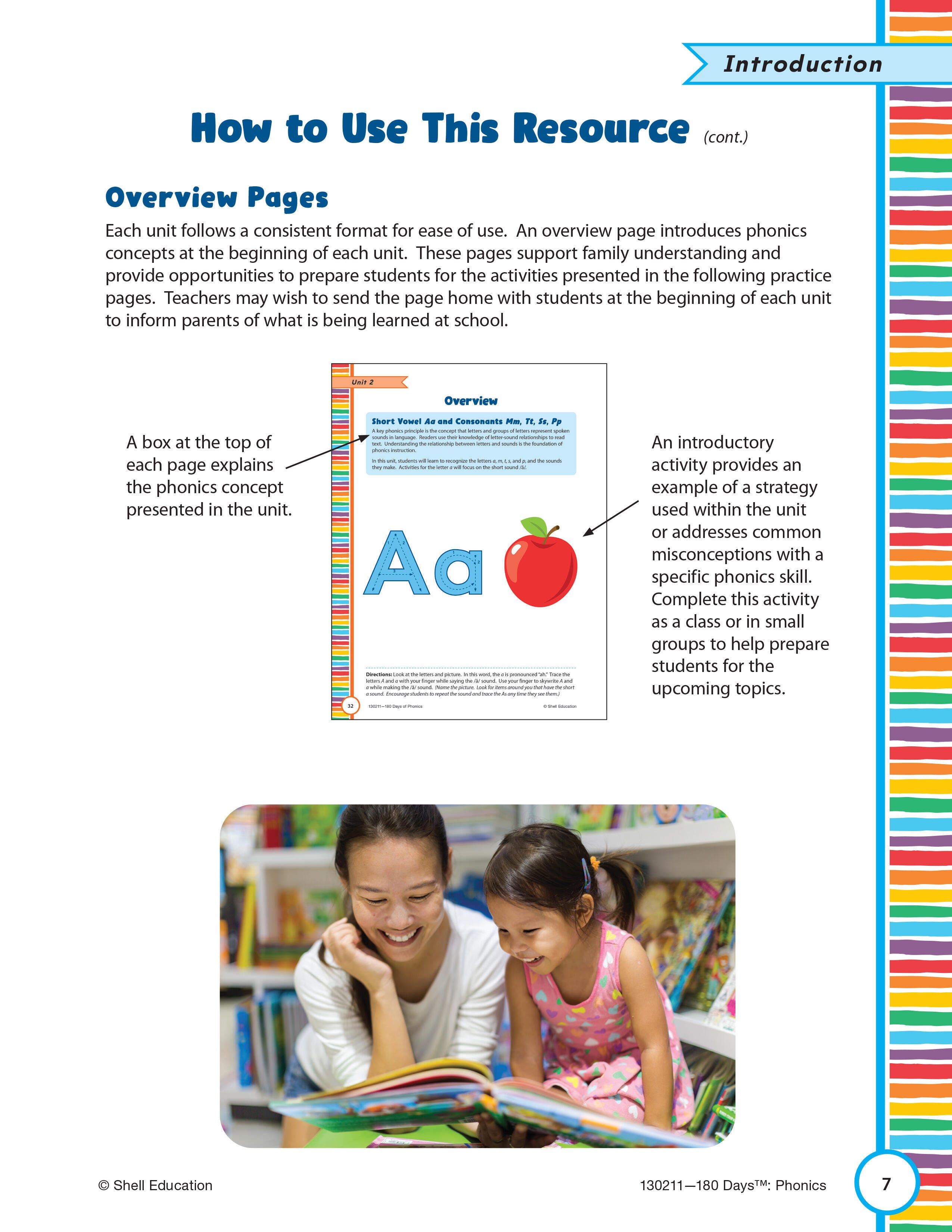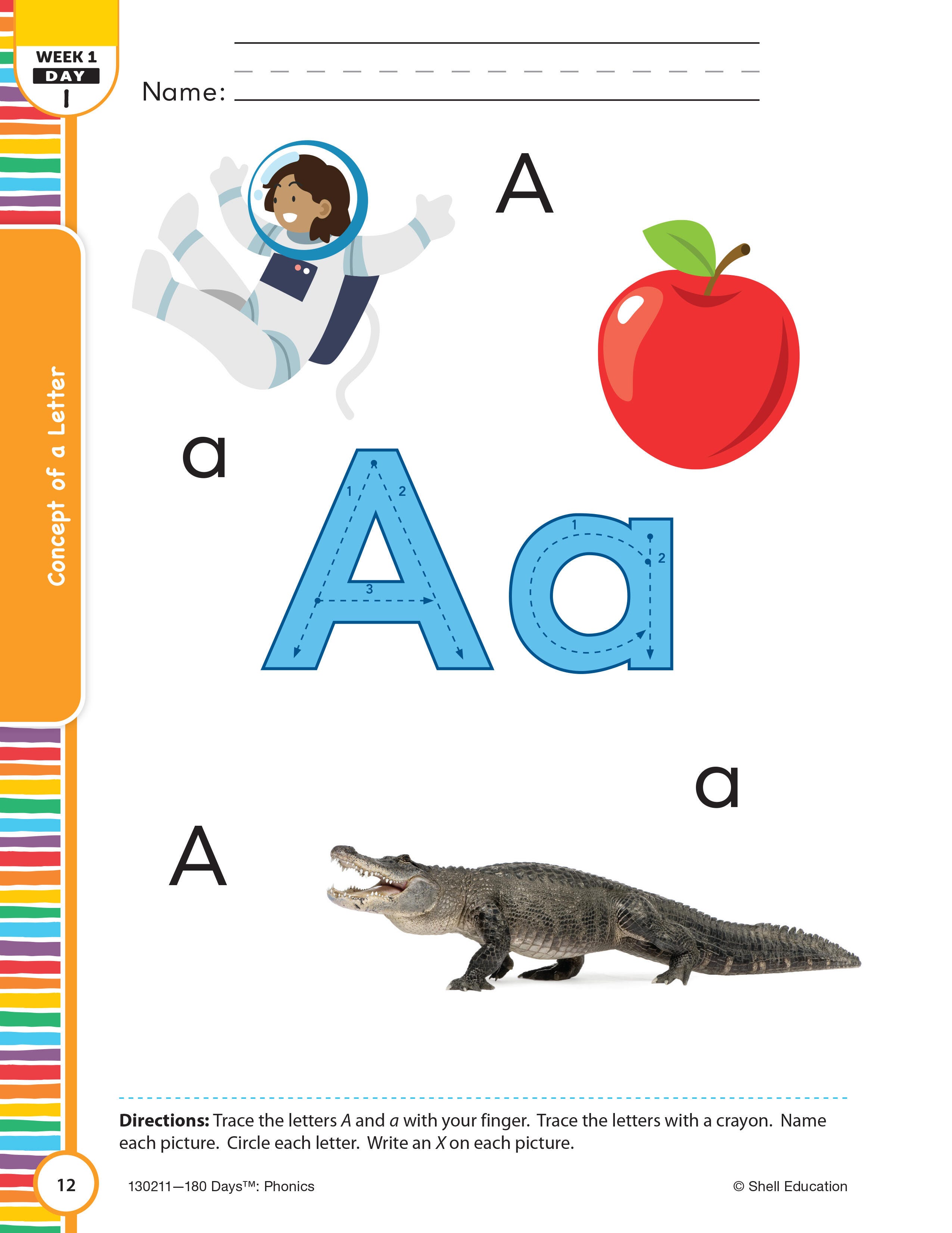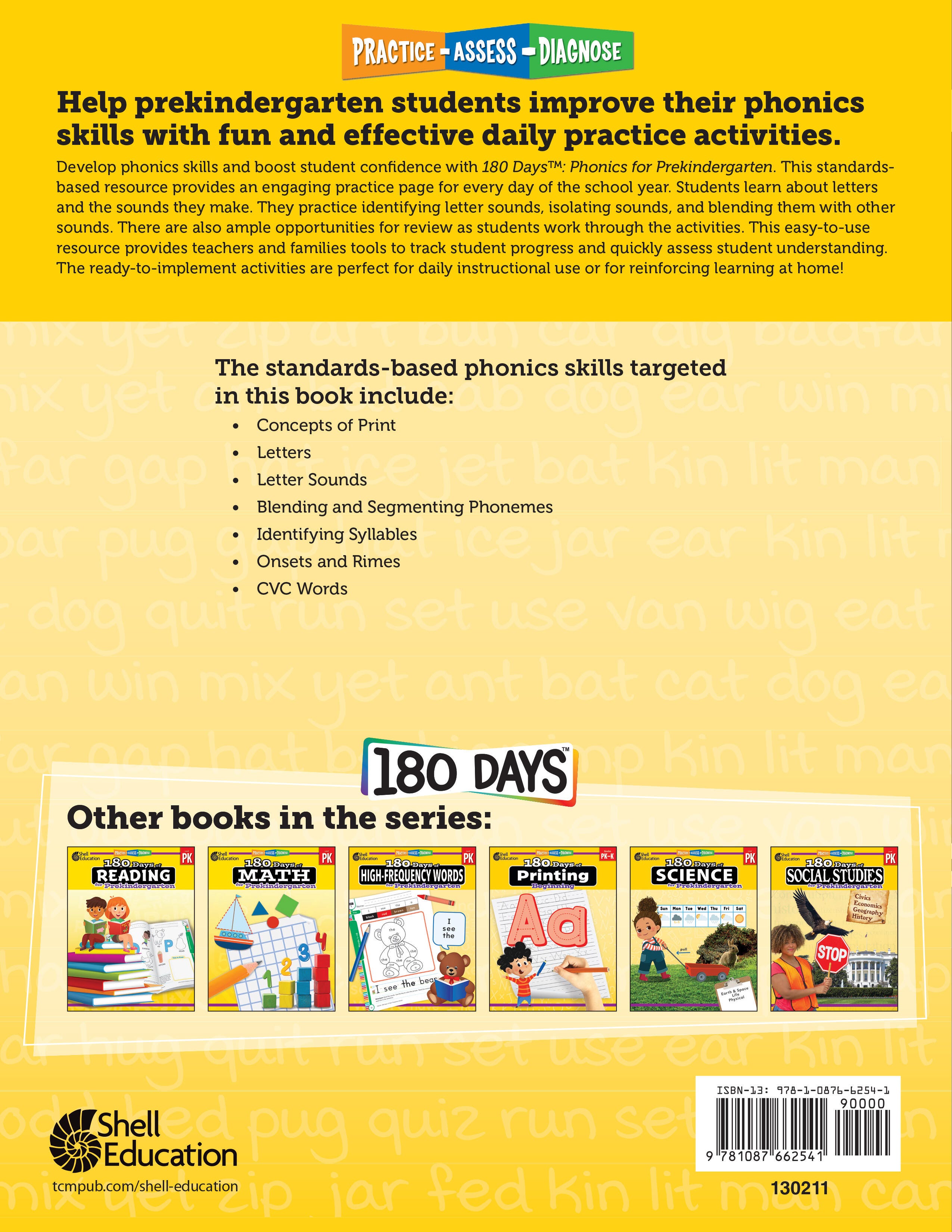 Shell Education delivers a fun and effective way to learn phonics, created by experienced educators! 180 Days™: Phonics offers a purposeful practice designed to help prekindergarten students master the basics of phonics through a variety of fun and interactive activities. This workbook is packed with exercises that focus on letter recognition, sound identification, and basic word formation, all presented in a playful, visually appealing, and age-appropriate format. Great for homeschooling or classroom learning, these workbooks also help kids retain educational knowledge during the summer or stay-at-home learning periods. This workbook supports foundational literacy development and keeps young learners motivated and excited about their phonics journey. Ideal for classroom use and at-home practice, it is a valuable tool for any early learner.Features