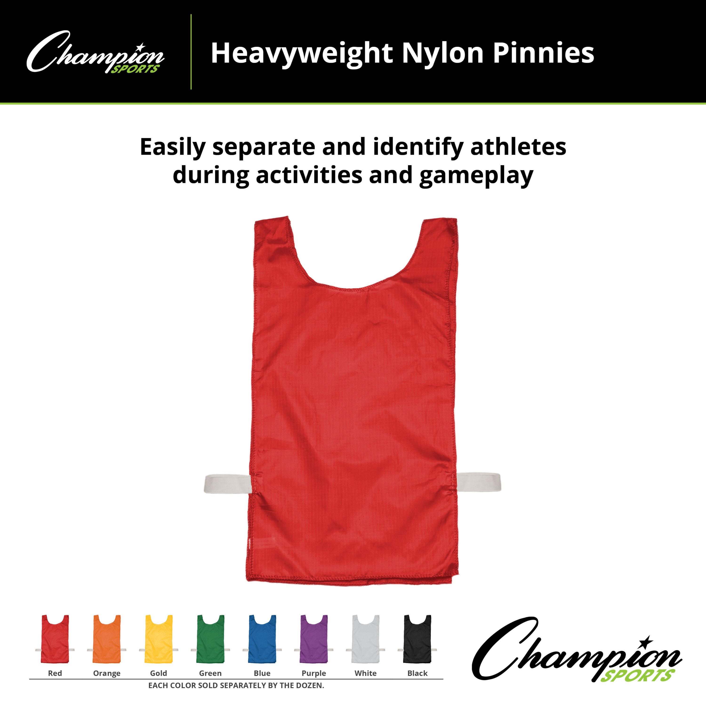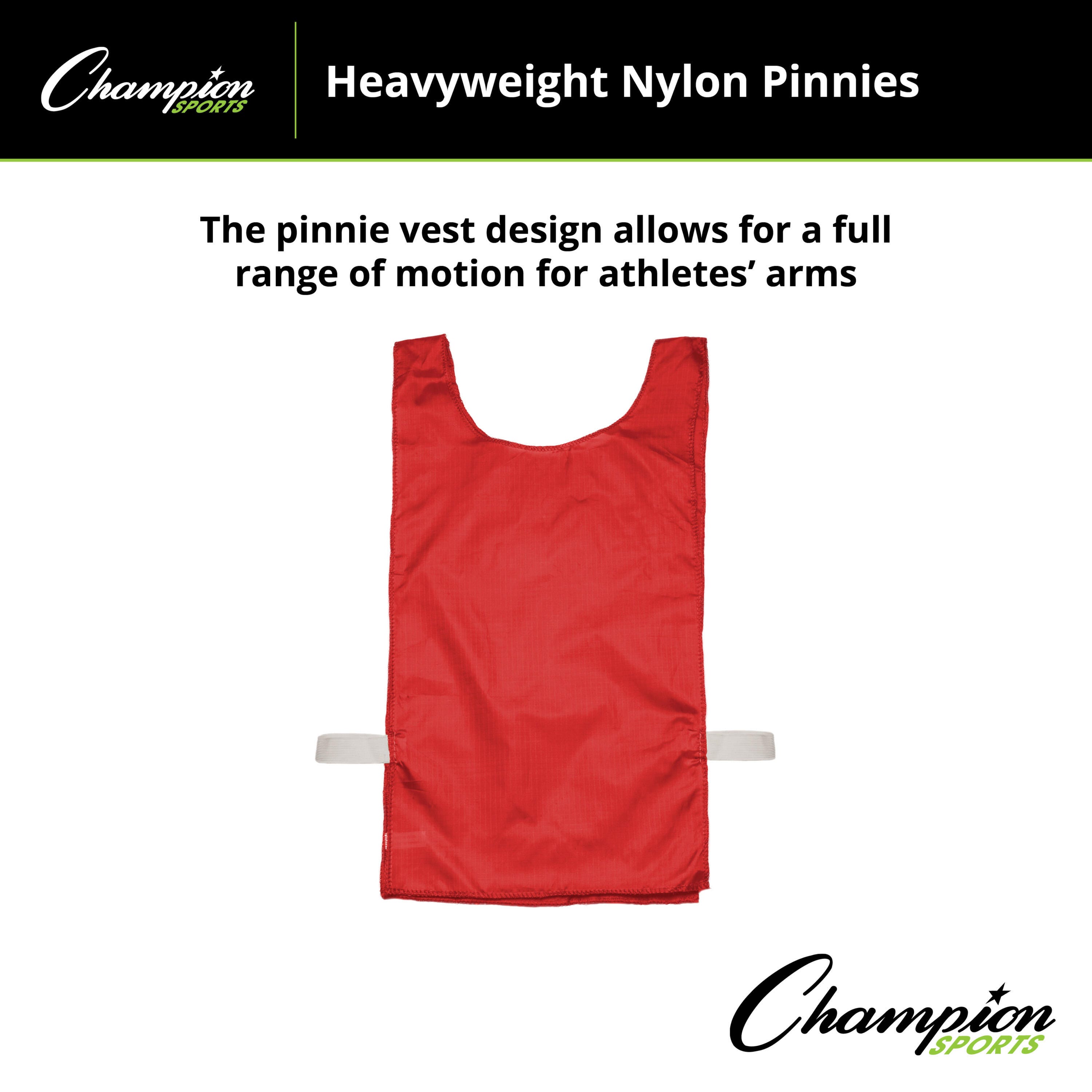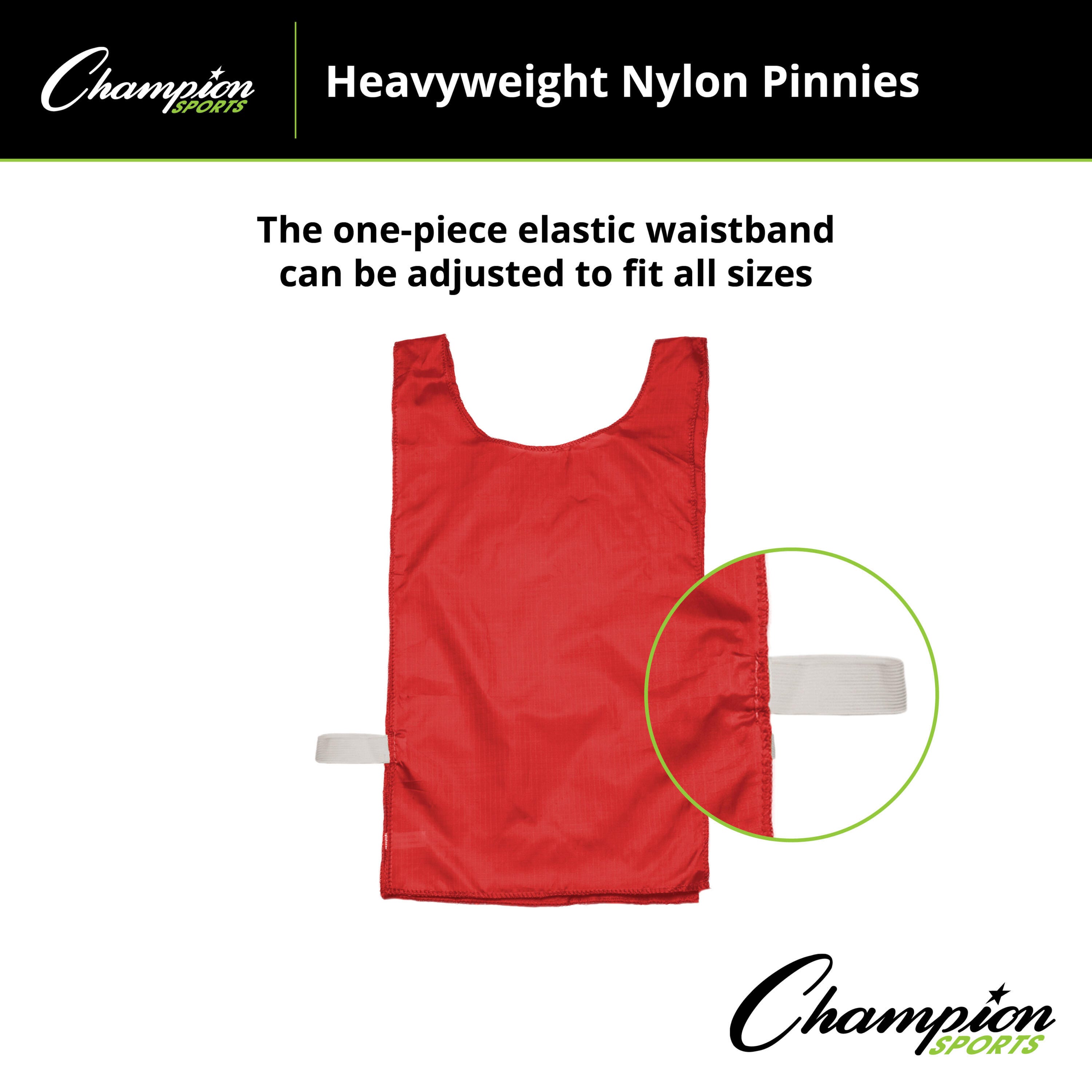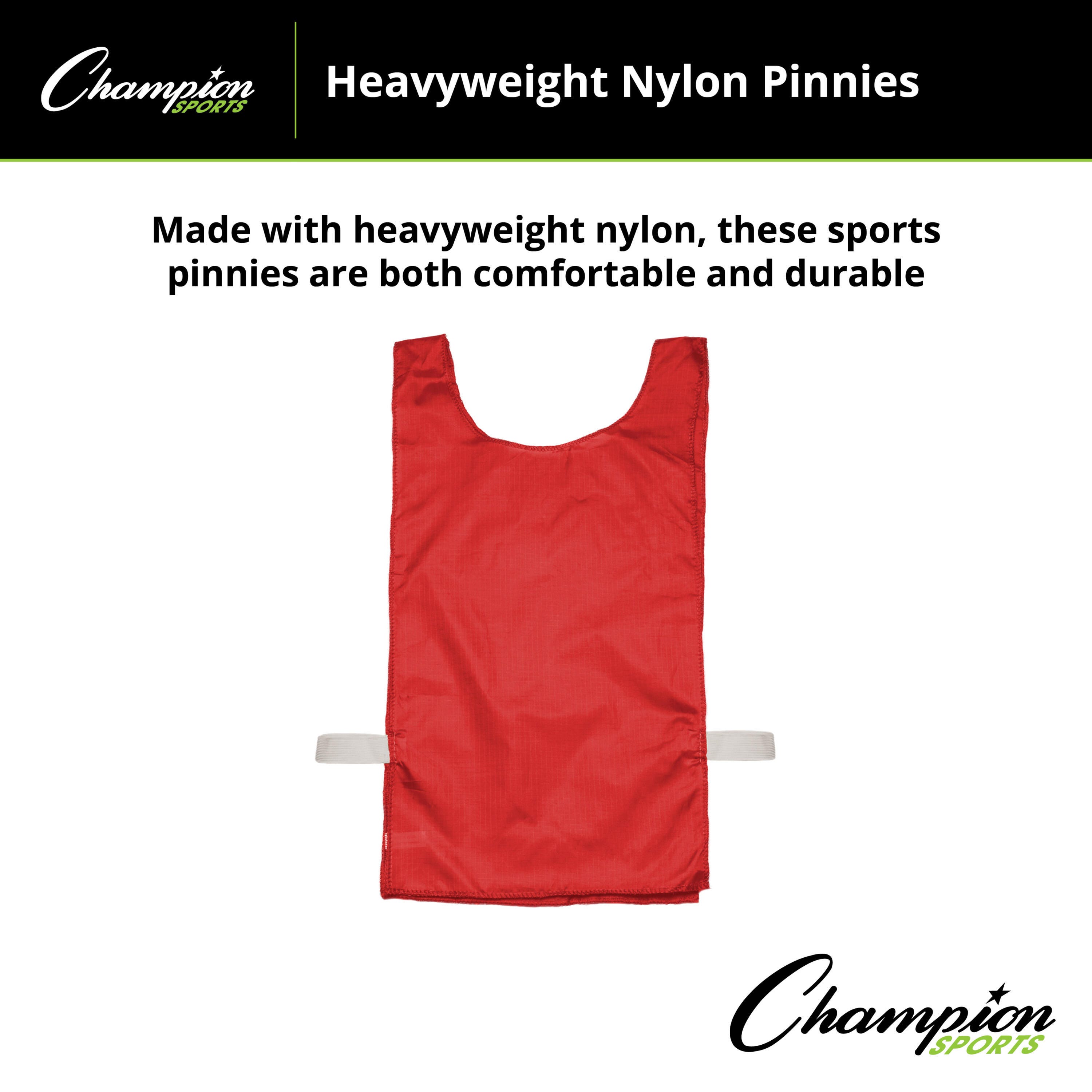 Keep your practices organized and your athletes moving with the Champion Sports Heavyweight Nylon Youth Pinnie. Engineered for the rigors of PE classes and competitive play, these pinnies offer a clear visual for team division without sacrificing player comfort or mobility. These 12 pinnies have a one-size-fits-most construction, with a elastic waist band to achieve a secure fit on players of different sizes and ages.Features
