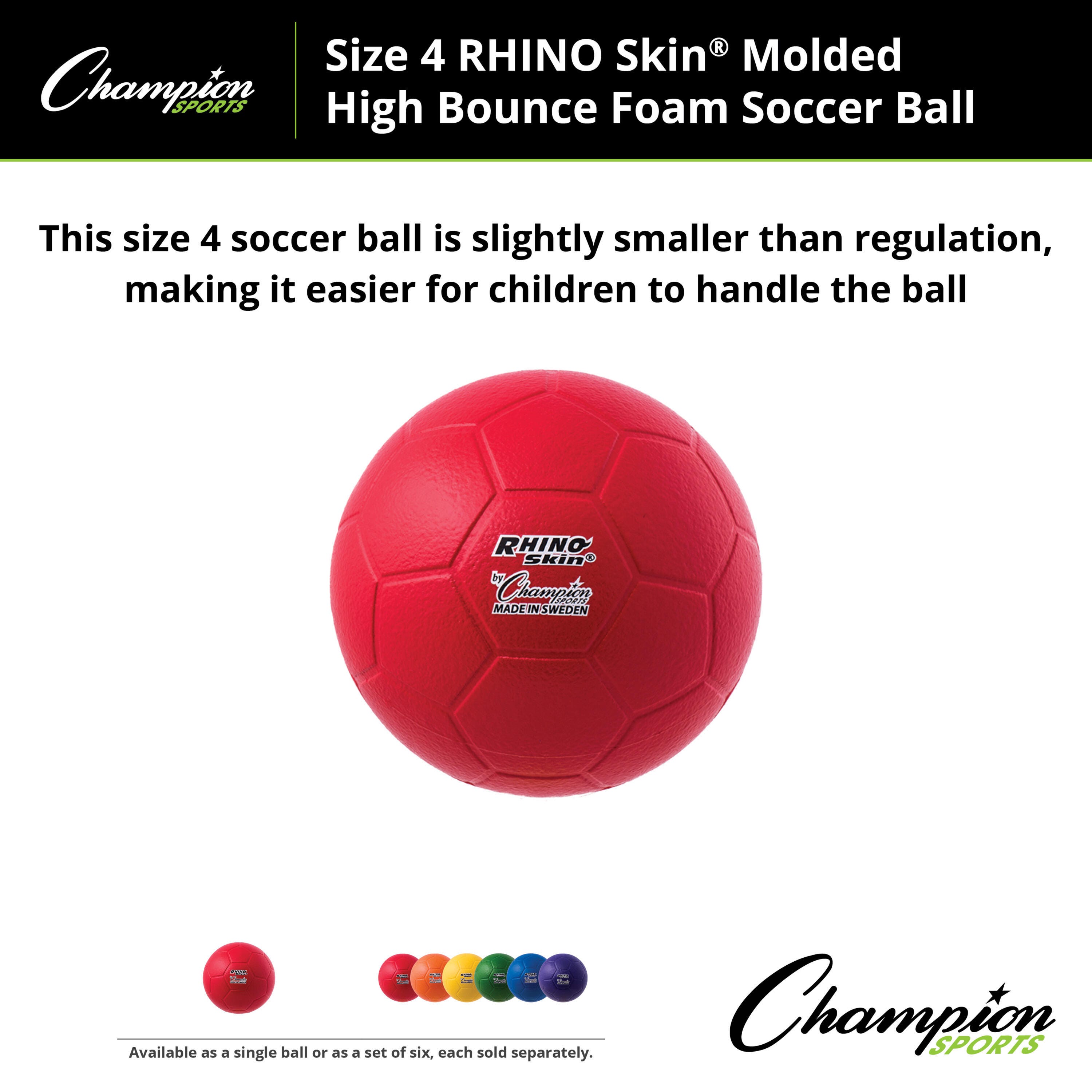 Master the Game with the Rhino Skin High-Bounce Soccer Ball from Champion Sports! Designed to build confidence and skill, this Size 4 ball (8 inch diameter) combines a high-density foam core with a soft-touch exterior to minimize impact while maximizing performance. Help young players hone their skills safely with the ultimate training tool for athletes ages 10 and up.