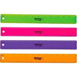 Switch out traditional wooden or metal rulers for Achieva Flexible Rulers! The pliable design retains its original shape and prevents snapping when bent. Sold as pack of 12, these 12 inch translucent rulers featuring classic inch/centimeter indicators are perfect for schoolwork or activities that require straight lines or measurements. Available in assorted Green, Pink, Purple, and/or Orange transparent colors; please note that the color of rulers is randomized upon order and shipment (sorry, no color choice).Features
