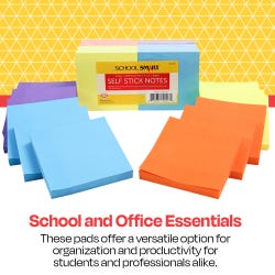 School Smart delivers this pack of Self-Stick Notes for colorful to-do lists, reminders, messages, and more! Each note features a reliable adhesive that provides a secure stick on most surfaces. The 3 x 3-inch notes provide enough room for jotting quick ideas, without taking up too much space on your desktop, planner, or monitor. Each pad contains 100 sheets. This pack includes 12 pads, 3 each in blue, green, yellow, and pink.Features