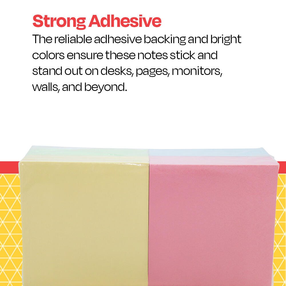 This pack of Self-Stick Notes from School Smart delivers an economical and versatile tool for organization in classrooms, offices, dorm rooms, and homes. The notes have a strong, durable adhesive that sticks to most surfaces. Each 3 x 3-inch note provides enough room for quick notes, without taking up too much space on your desktop, planner, or monitor. This pack contains 12 pads, 3 each of the colors blue, pink, yellow, and green.Features